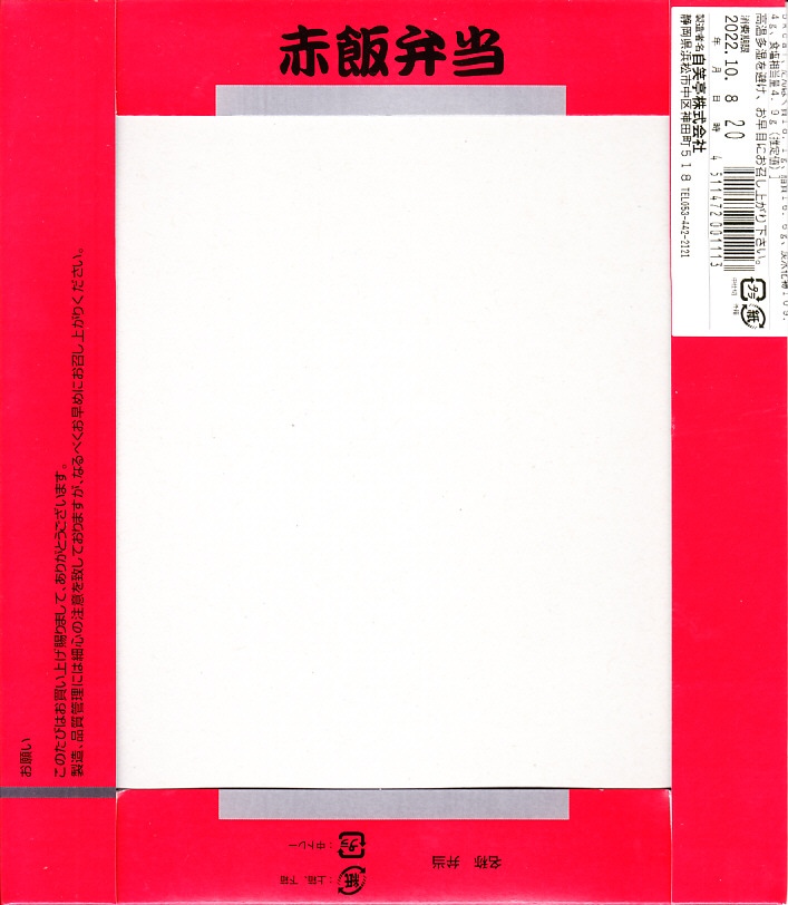 1975(昭和50)年3月の発売か。その名のとおり、浜松駅弁の赤飯弁当。赤地におたふく顔の、ふたの絵柄が印象的。ボール紙の容器にふたつの白いプラ製のトレーを入れ、一方が赤飯、他方がおかずで、海老フライ、ごま団子、鶏カレー煮、エリンギ天、焼さば、にんじん、れんこん、こんにゃく、ひじき煮、大根桜漬。つまり、上記の浜松駅弁「まくのうち弁当」の、御飯を赤飯に替えたもの。価格は2004年時点で760円、2013年時点で810円、2014年4月の消費税率改定で840円、2020年時点で860円、2022年時点で900円。