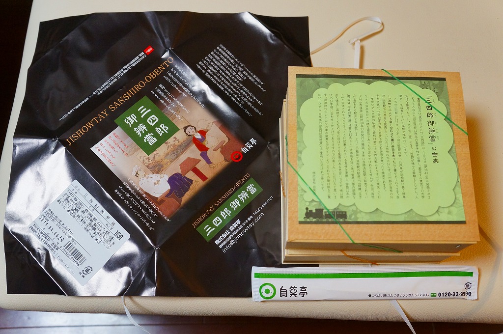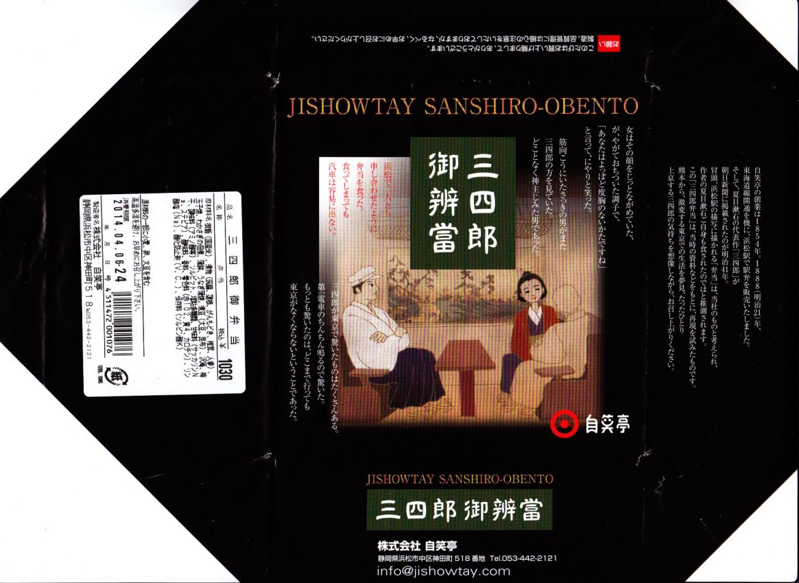 2011(平成23)年9月の発売。夏目漱石が1908(明治41)年に発表した作品「三四郎」に、汽車に乗り浜松駅で弁当を食べた描写があることから、当時の浜松駅で売られた駅弁の再現を試みたものである。薄い正方形の経木折をふたつ重ねる使い方は、明治時代から第二次大戦前まで、全国各地の幹線鉄道の駅弁で親しまれた姿である。