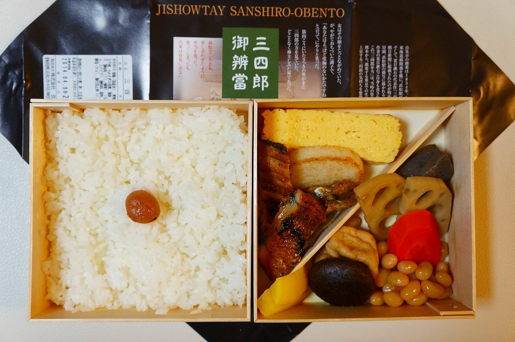 中身は当時の雑誌の記述により「細鰻、玉子焼、蒲鉾、河魚佃煮、蓮、椎茸を副食とし一寸体裁も佳く先ず普通上等の部類なり」を再現。下段に日の丸御飯、上段にこれらの茶色いものばかりを詰める。ウナギの質は残念に思うも、煮物や焼かまぼこなどの風味は良好。駅弁のコンセプトにこれだけ筋を通したものには、なかなか出会えないと感心した。2014年頃までの販売か。