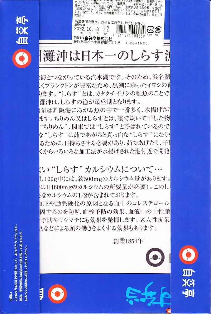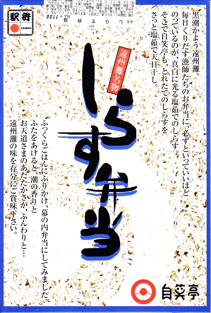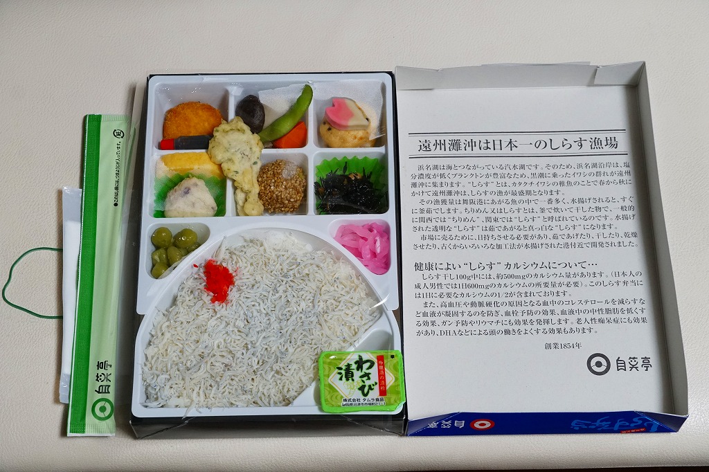 駅弁で時々見掛けるシラス弁当の元祖格か。2010年代にウナギの暴騰でうなぎ弁当が容易に買えなくなってからは、浜松駅弁の主役になった感がある。価格は2003年時点で1,000円、2014年4月の消費税率改定で1,030円、2020年時点で1,050円、2022年の購入時で1,100円。