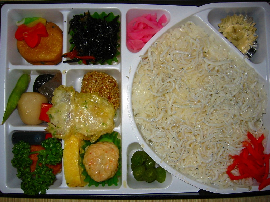 1980年代の発売か。しらすの白い写真でできたふたには、表面にも裏面にも宣伝文が豊か。白いトレーのトンネル形か半円形の部分に、白飯を詰めて、しらすの塩ゆでで覆い、紅生姜で彩り、わさび漬とうぐいす豆と大根桜漬を添える。小さな6区画のおかずは、ひじき、ごま団子とエリンギ天、玉子焼とイカボール煮、魚すり身フライ、煮物、がんもどき。
