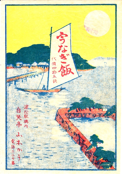 1926(大正15)年6月13日の調製と思われる、昔の浜松駅弁の掛紙。浜名湖の帆掛船に商品名を記し、手前にあるのはウナギの養殖場だろう。食材でなく風景で、中身と絵柄を合わせた。