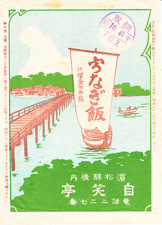 1932(昭和7)年10月3日10時の調製と思われる、昔の浜松駅弁の掛紙。価格は30銭や35銭だった幕の内弁当より、やや高め。浜名湖と弁天橋と帆掛け舟などが描かれていると思う。浜松が日本一のウナギの産地として栄えたのは戦後昭和の時代だが、東京の養魚家である服部倉次郎が養殖の適地として浜名湖沿岸で養鰻を開始したのは1900(明治33)年であり、1916(大正5)年には駅弁になり、大正時代末期までには有数のウナギ産地となっていた。