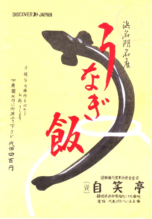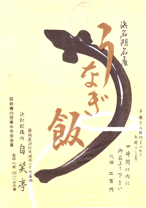 1963(昭和38)年4月27日の調製と思われる、昔の浜松駅弁の掛紙。上記や下記のとおり、浜松駅弁のうなぎ弁当では、この絵柄が長く使われた。