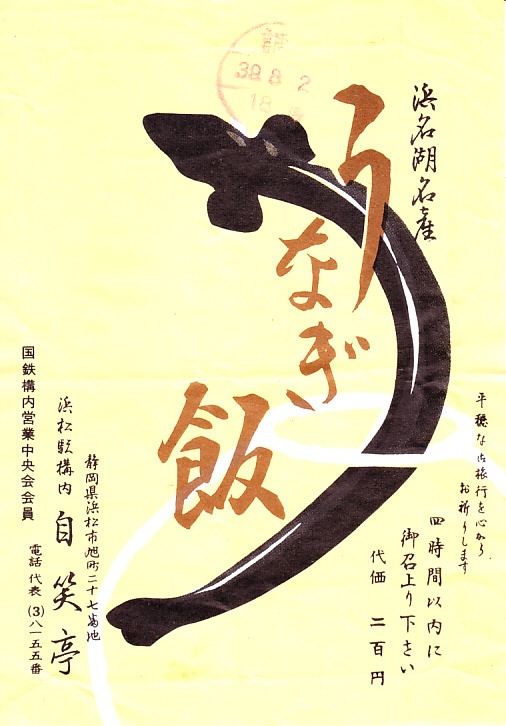 1964(昭和39)年8月2日18時の調製と思われる、昔の浜松駅弁の掛紙。上記や下記のとおり、浜松駅弁のうなぎ弁当で長く使われた絵柄。