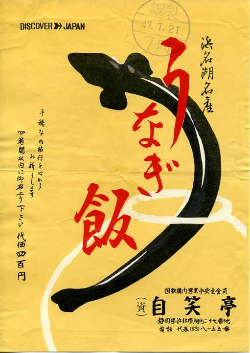 1972(昭和47)年7月21日の調製と思われる、昔の浜松駅弁の掛紙。調製印に加えて価格と「DISCOVER JAPAN」ロゴマークから、調製時期に関して疑いはないが、それがなければもっと昔の時代を名乗っても大丈夫そうな、古風なデザインの掛紙である。