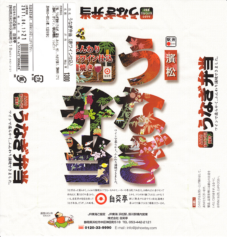 2011(平成23)年4月17日に購入した、浜松駅弁の掛紙。コンピュータグラフィックの香りがするデザインが販売開始から10年以上使われていた。そしてなんといっても、現在と価格が大きく異なる。シラスウナギの入手難により上がる一方のウナギ相場は、2012年に倍額のキロ4000円台へ高騰、鰻丼の価格も当然に上がり、老舗のうなぎ屋の廃業が相次ぎ、駅弁もこうやって高騰した。