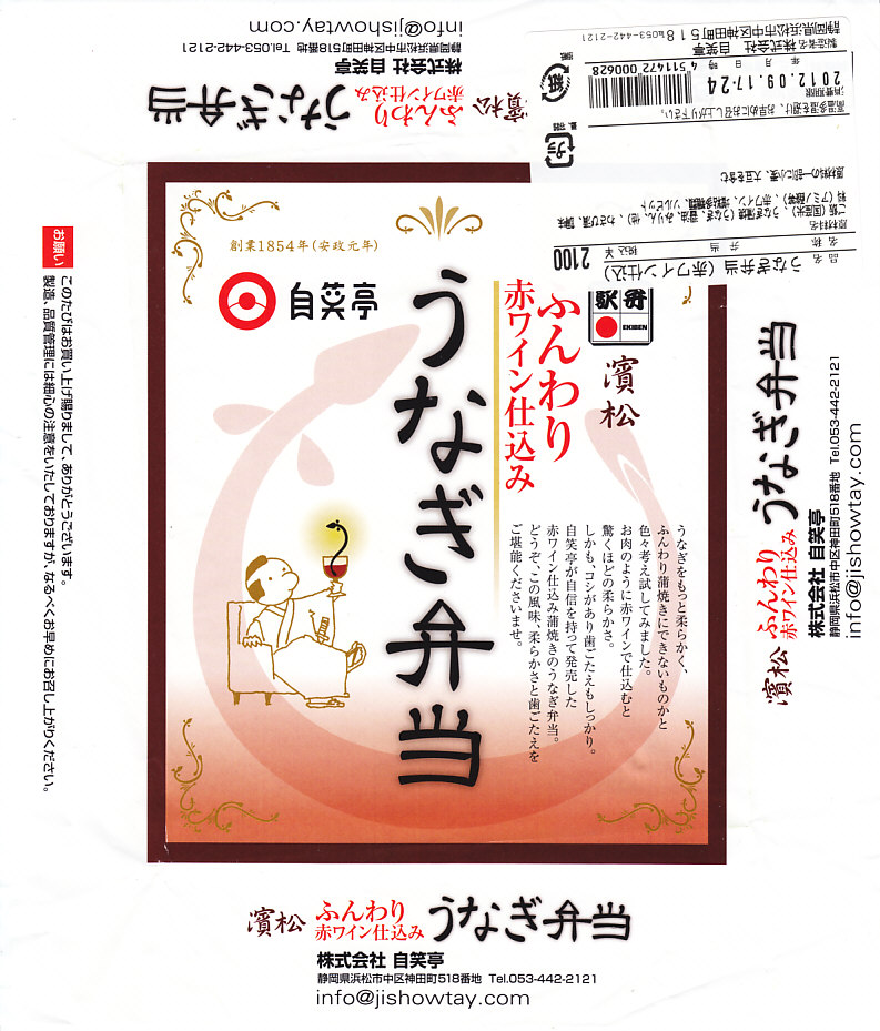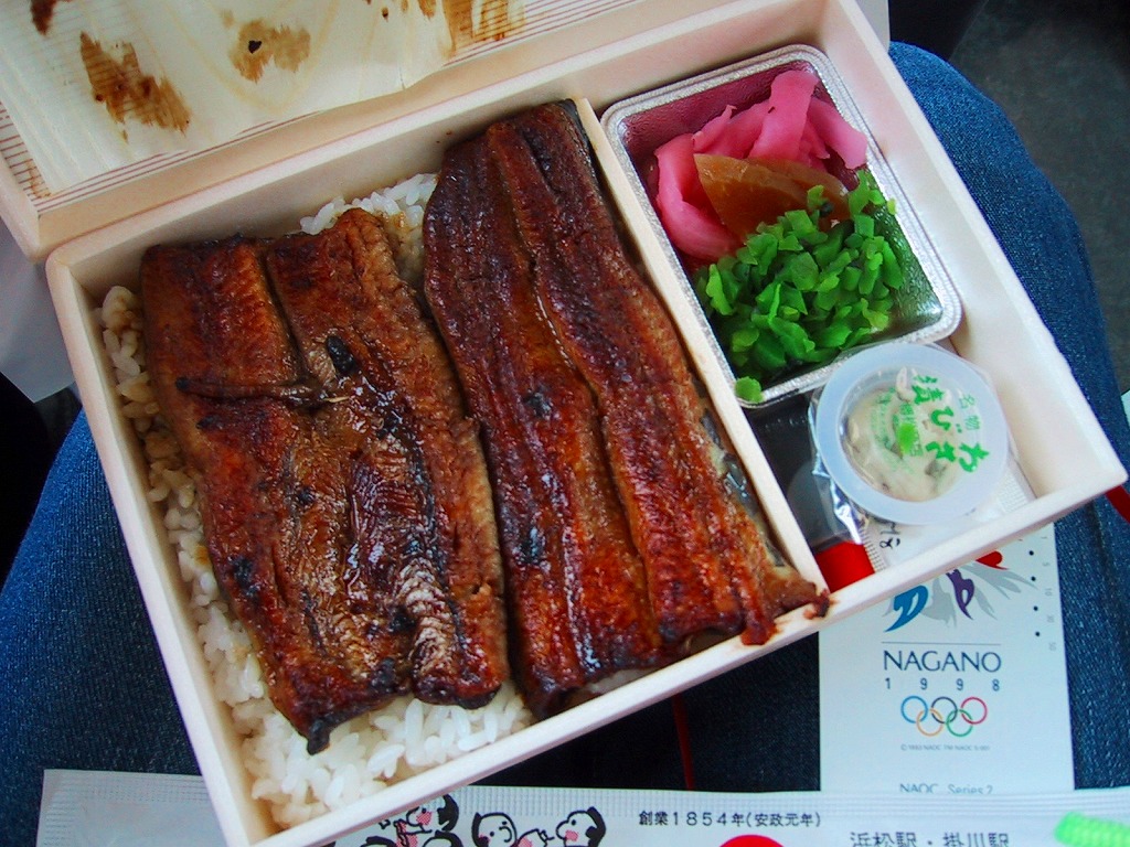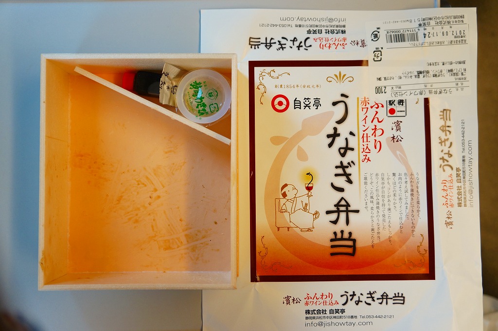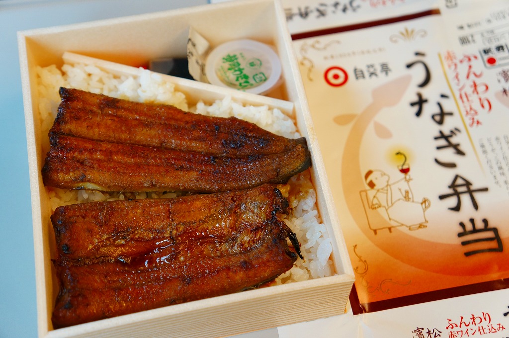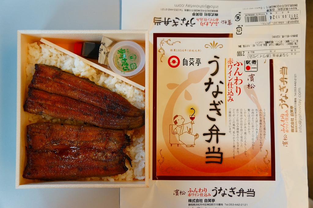 2000(平成12)年の発売。浜松駅弁のウナギ弁当の筆頭格。容器に白御飯を敷き、赤ワインで仕込んだというウナギの蒲焼きを載せて、タレ、山椒、わさび漬けカップを添えるもの。ウナギは確かにふんわり柔らかく、好評にも肯けるが、そのため従来の駅弁「うなぎ飯」は注文生産となってしまった。