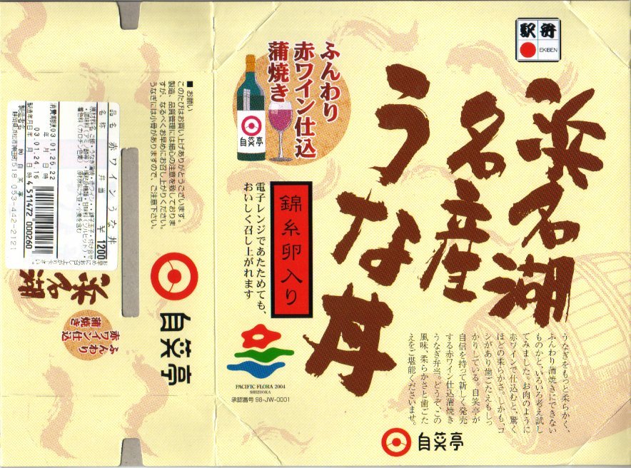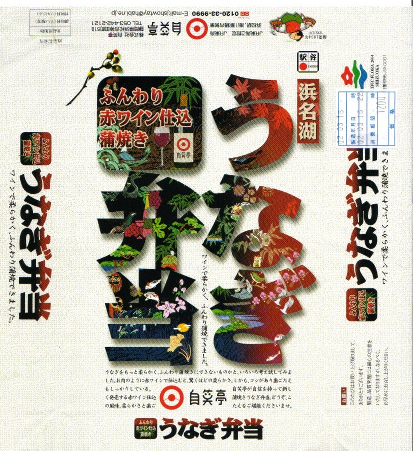 2004(平成16)年12月5日に購入した、浜松駅のお弁当の掛紙。その絵柄は異なるが、容器や中身は2008年のものと同じ。当時は浜松駅の改札外コンコースに屋台を出して、このうなぎ弁当を販売していた。