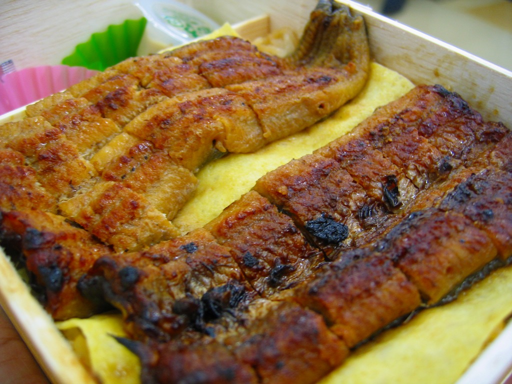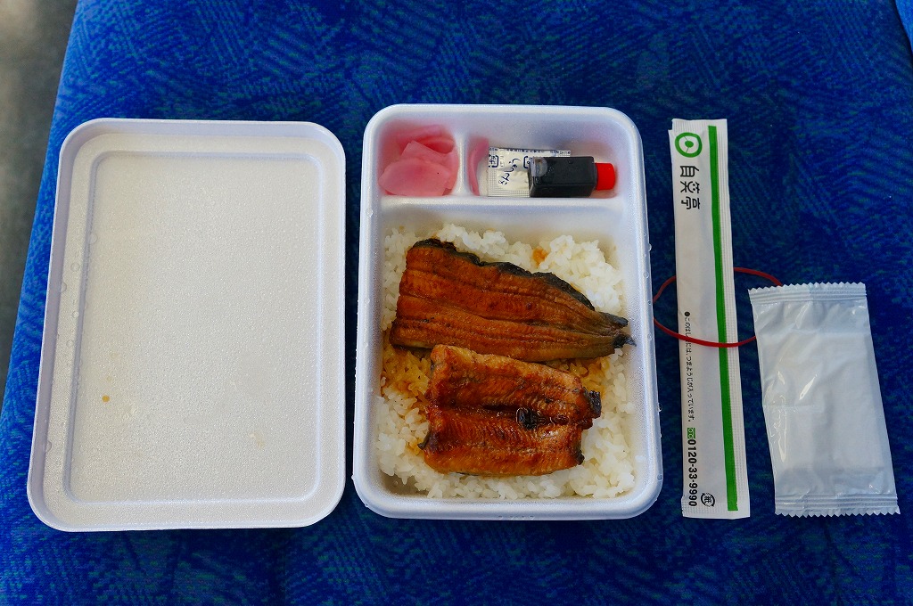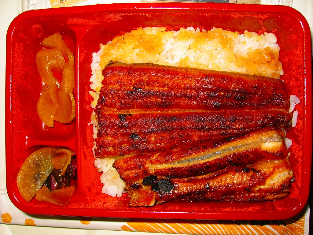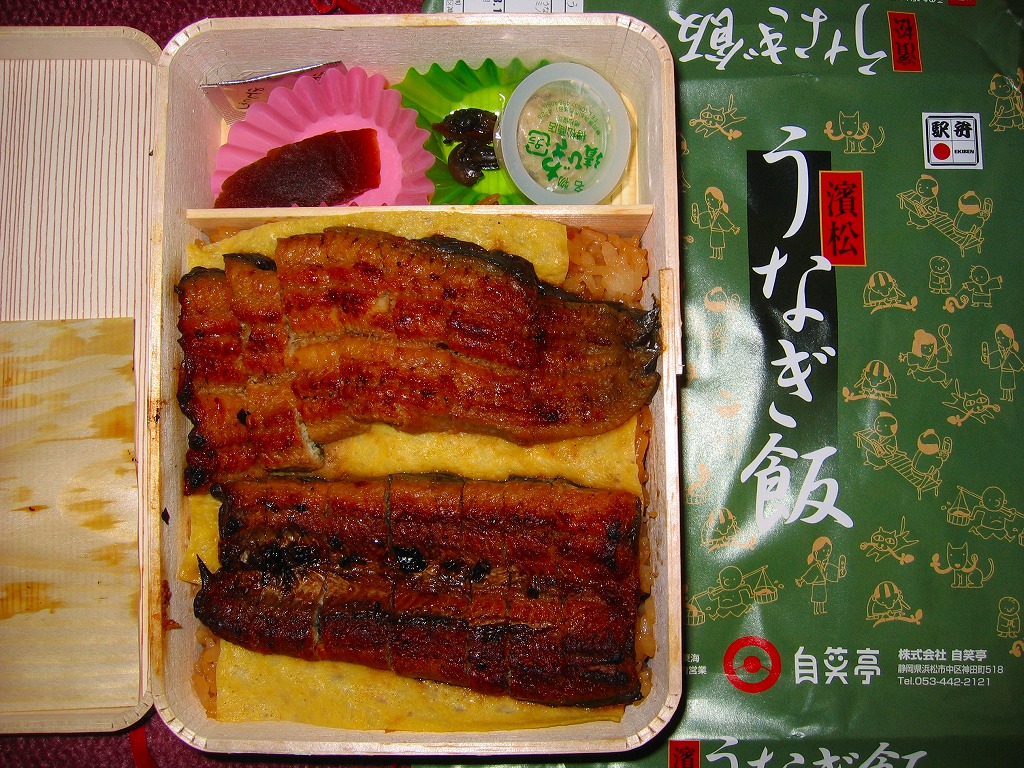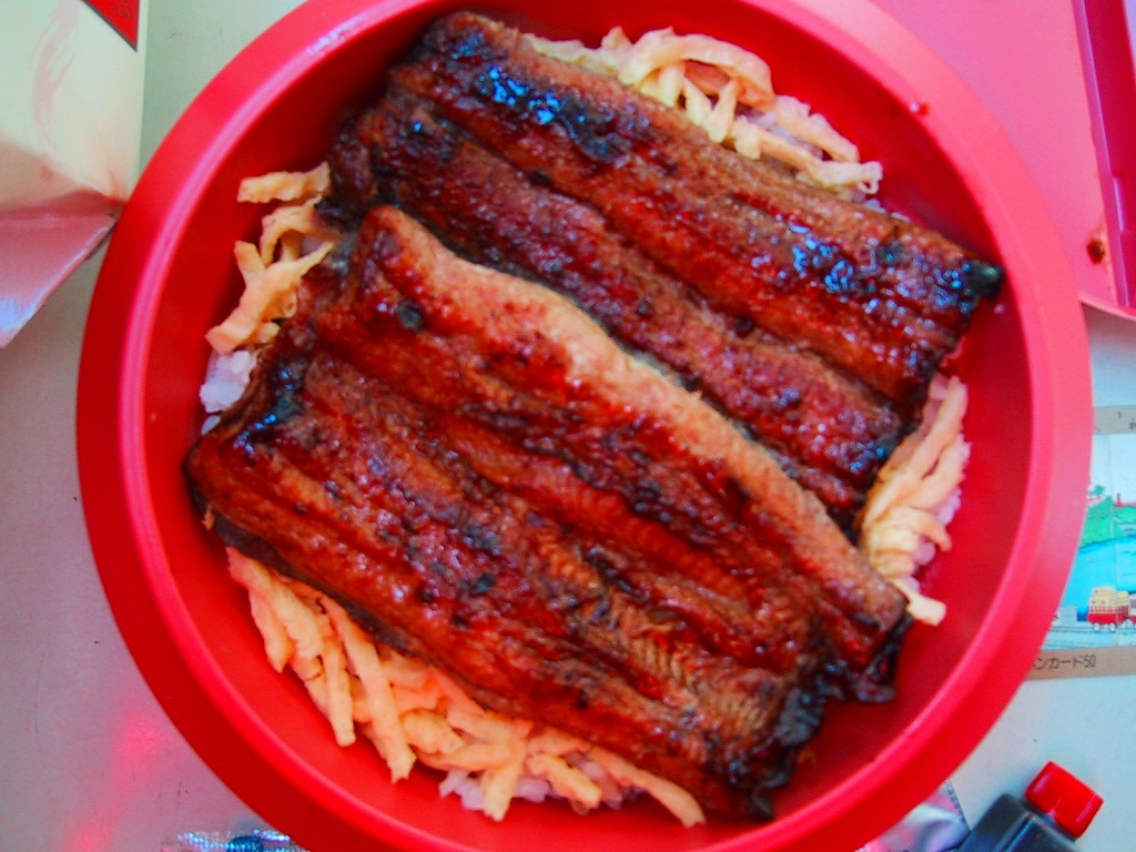 赤い薄手の樹脂製容器をボール紙の枠に入れる。中身は御飯に錦糸卵を敷いて鰻蒲焼を載せる、駅弁の名前どおりの鰻丼。駅弁大会で冷たい状態のものを購入し食べたら、御飯がパサパサで錦糸卵はゴワゴワ、メインの鰻蒲焼はゴム板を食べているよう。どうも美味しくいただくには電子レンジ等での加熱が必要なようで、ふたにもそれを勧めるシールが貼られる、冷めたら駄目な、駅弁らしくない駅弁。現地では他の鰻飯駅弁と同様、暖かい状態で販売されているものと思われる。2004年頃までの販売か。