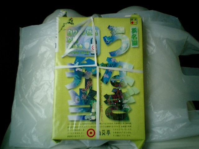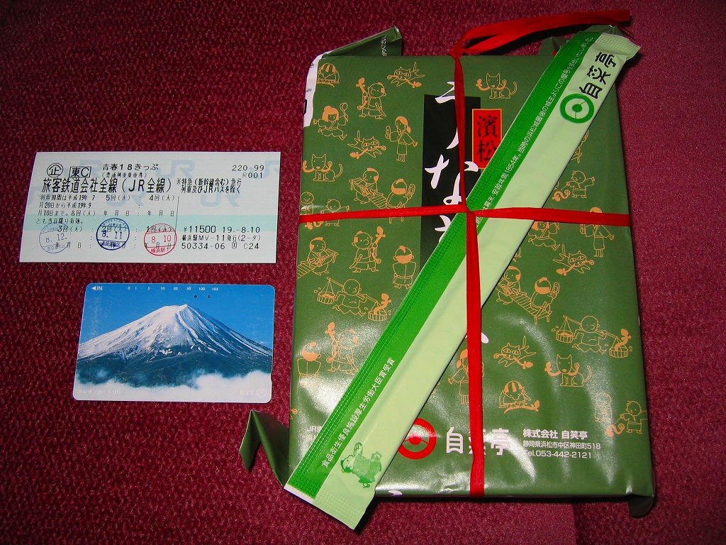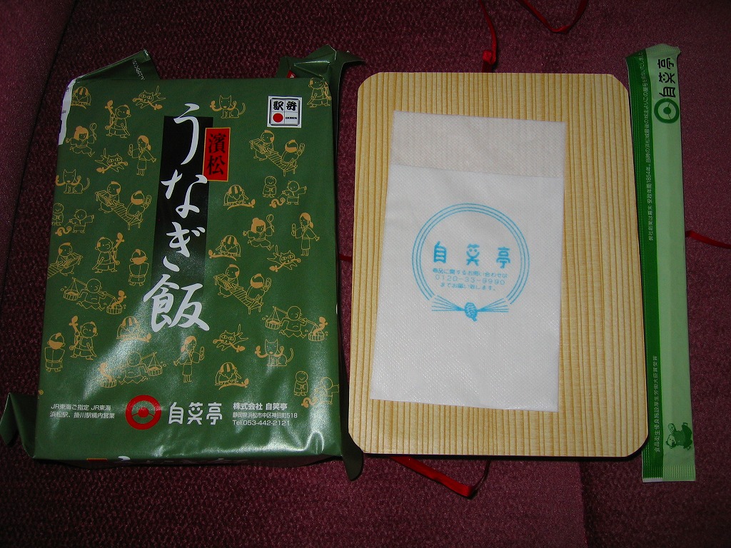 2002(平成14)年3月16日に購入した、浜松駅弁の掛紙。上記の2011年のものとだいたい同じだが、値段が100円安いことと、当時は「濱松」ではなく「浜名湖」を名乗っていたことと、食品表示ラベルがなかったことがわかる。この時は中身に薬味も入っていた。