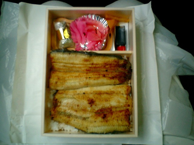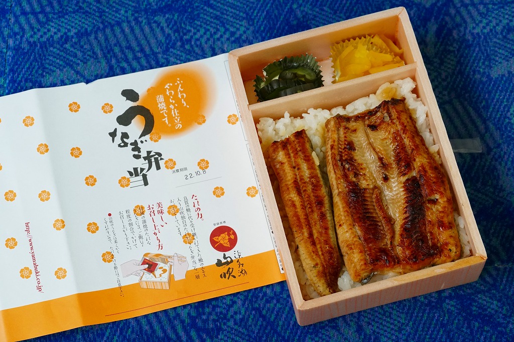 2006(平成18)年の秋頃に発売か。経木枠のちょっと深めな長方形容器を、濃緑色でよく見るとファンシーな絵柄をちりばめた掛紙で包む。中身はタレ御飯の上に薄焼き玉子を敷き、ウナギ蒲焼きを2切れ置いて、わさび漬、ウナギ肝佃煮、奈良漬を添付するもの。