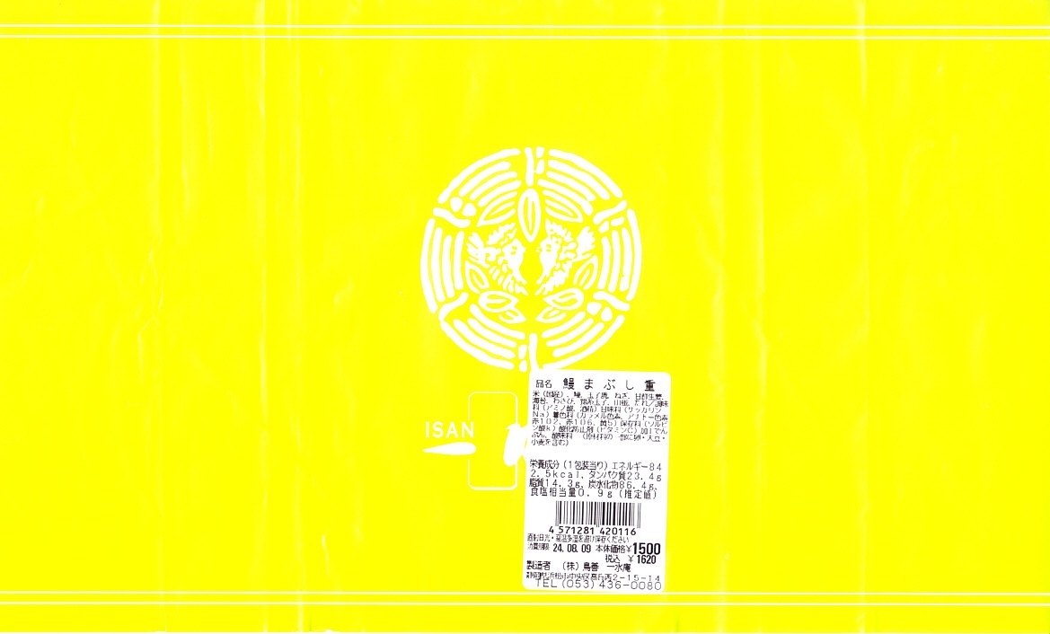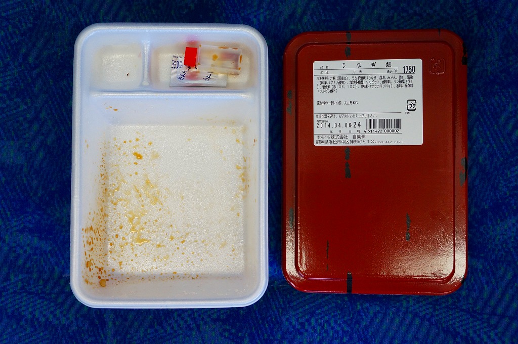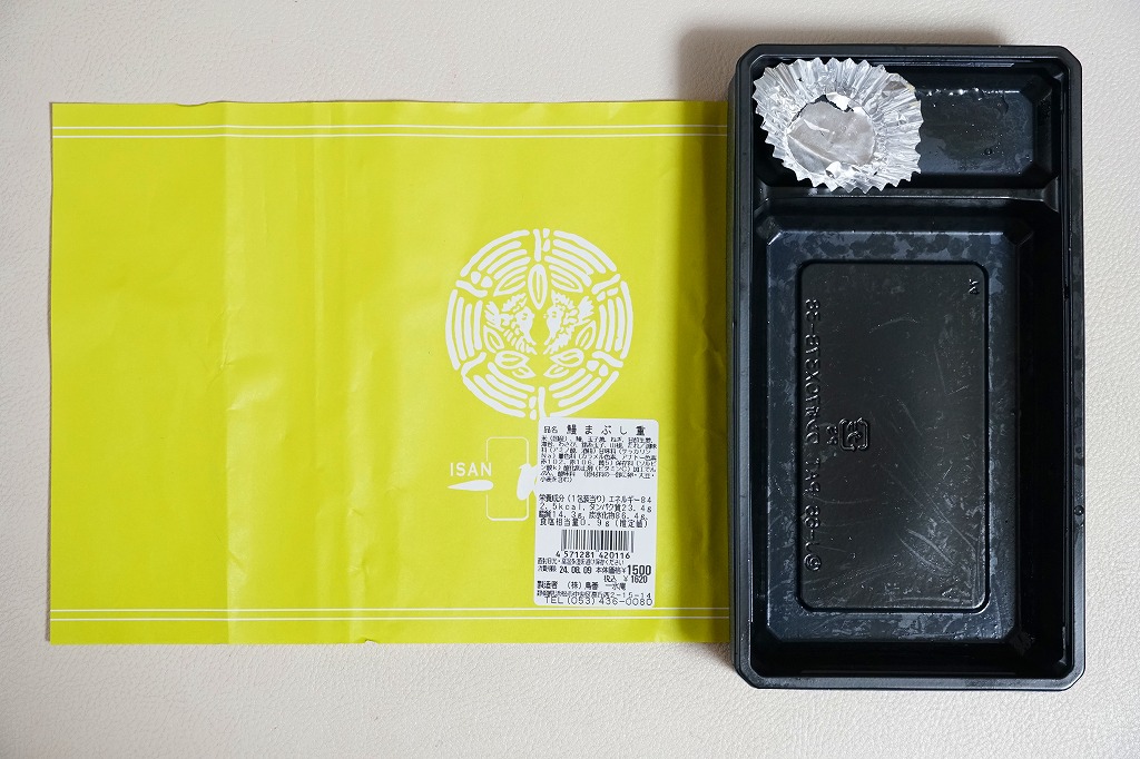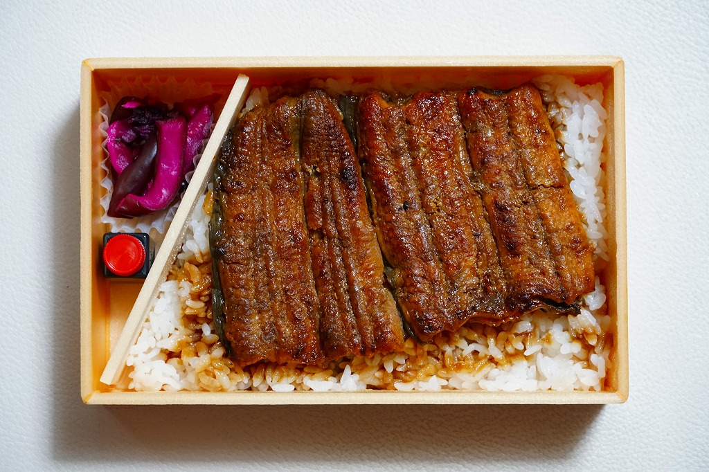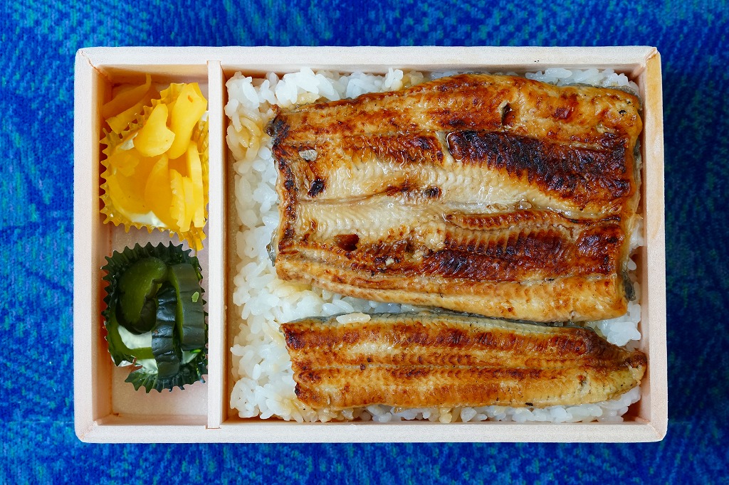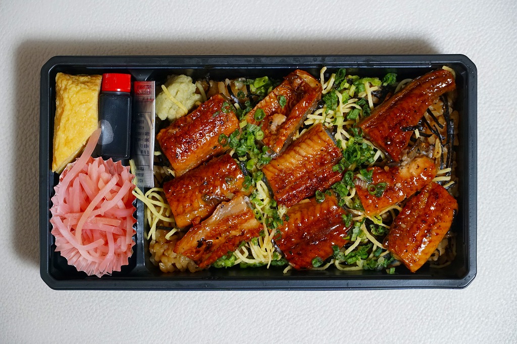 ふたにふちのある発泡材容器に、商品名とアピール点を書いた掛紙を巻く。中身は白飯をウナギの蒲焼きで覆い、2種の漬け物を添えるもの。つまり鰻重。色も風味もあっさり白いウナギを、塩気の強いタレでいただく。調製元は静岡と東京に4店舗を持つウナギ販売店で、1948(昭和23)年にうなぎの養殖で創業し業態を変えていったという。