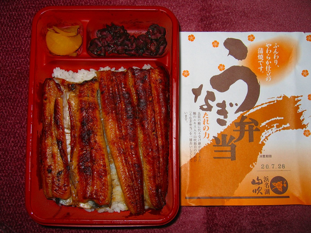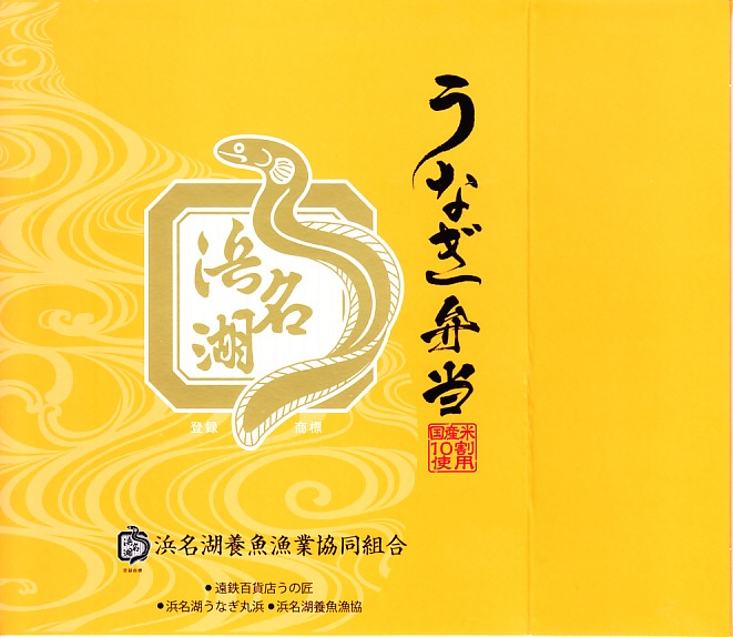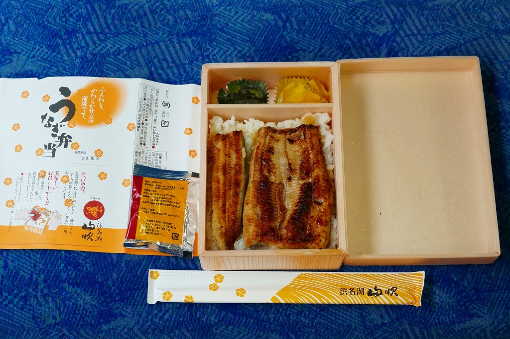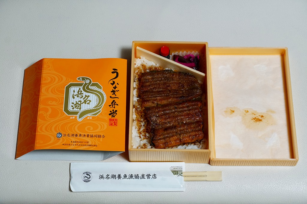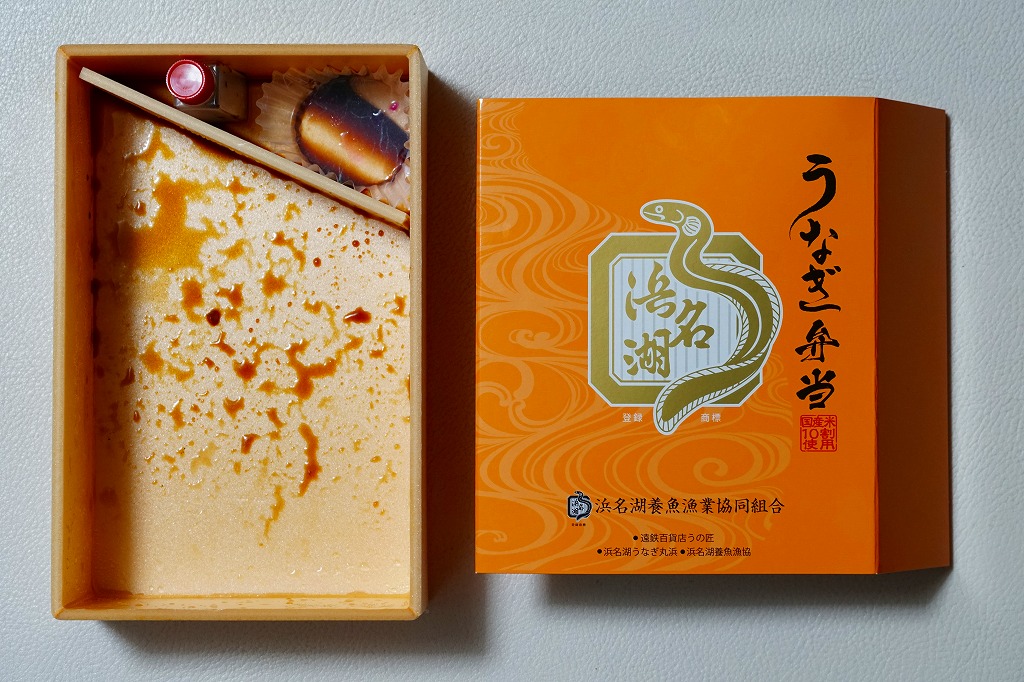 ふたにふちのある発泡材容器を、商品名を描いた橙色のスリーブにはめる。中身は白飯をウナギの蒲焼きで覆い、柴漬けとタレを添えるもの。赤黒いウナギは、脂が控えめで白身魚の食感がある、スーパーやファストフードの脂と弾力と柔らかさが豊かなものでない、浜名湖沿岸で定評の鰻屋で食べる鰻重の味を持つと思う。調製元はその名のとおり、浜名湖地域の養殖漁業の振興と発展を目的に、1949(昭和24)年に設立された協同組合で、ウナギの加工販売も行い、浜松市内に直営店3店を持ち、浜松駅と遠鉄百貨店では弁当も売る。