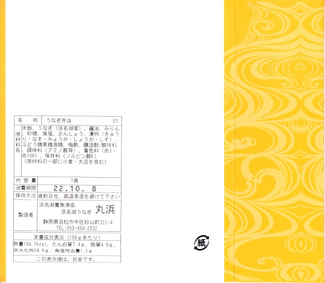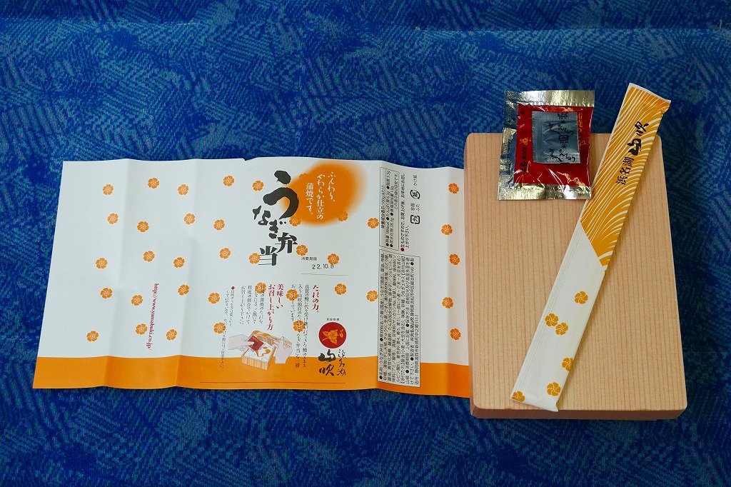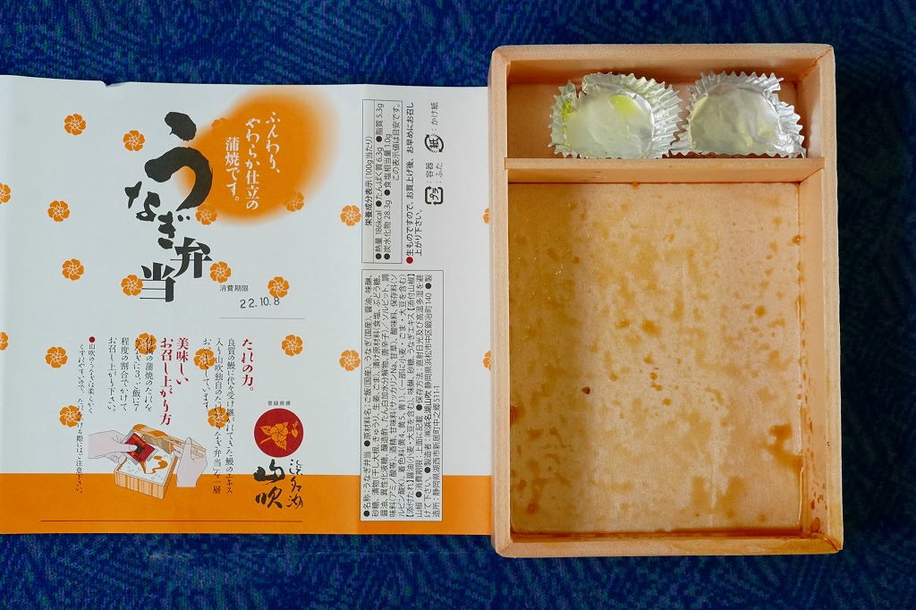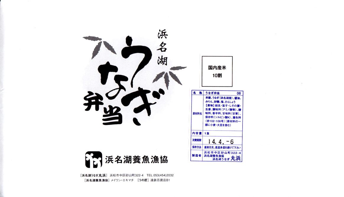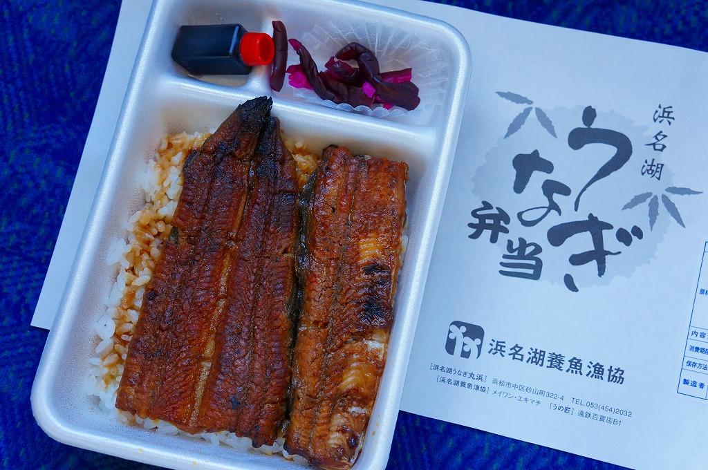 ふたにふちのある発泡材容器を、商品名を描いた橙色のスリーブにはめる。中身は白飯をウナギの蒲焼きで覆い、柴漬けとタレを添えるもの。赤黒いウナギは、脂が控えめで白身魚の食感がある、スーパーやファストフードの脂と弾力と柔らかさが豊かなものでない、浜名湖沿岸で定評の鰻屋で食べる鰻重の味を持つと思う。調製元はその名のとおり、浜名湖地域の養殖漁業の振興と発展を目的に、1949(昭和24)年に設立された協同組合で、ウナギの加工販売も行い、浜松市内に直営店3店を持ち、浜松駅と遠鉄百貨店では弁当も売る。