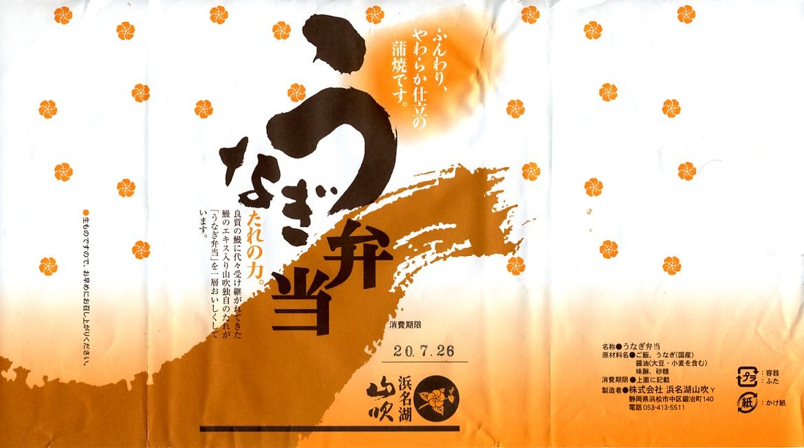 2008(平成20)年7月26日に購入した、浜松駅のお弁当の掛紙。上記の2022年のものと、絵柄は異なるが素材は共通。容器の形は違うが、中身は変わらない。2012年にウナギの価格が急騰する前は、うなぎ弁当は日本全国で千円前後にて買えた。