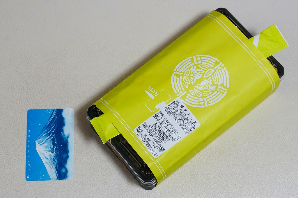 浜松駅で買えた、うなぎ弁当。駅の高架下の商業施設「コスタ」で、公式な駅弁屋を含め3社の弁当販売店が並び、それぞれにウナギの弁当を販売する。これは一番奥の「浜名湖養魚漁協直営店 丸浜」の商品。同じ中身でウナギの量や大きさが異なる「浜名湖」(1,800円)「直虎」(2,700円)「家康」(3,200円)の3種類があり、その中で最も安いものを購入した。