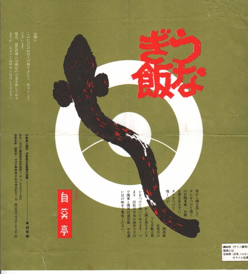 1969(昭和44)年2月20日(木)の調製と思われる、昔の浜松駅弁の掛紙。世に出回る浜松駅弁うなぎ飯の上記や下記の掛紙より、古風に元気な絵柄だと思う。