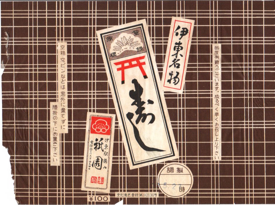 1963(昭和38)年5月27日の調製と思われる、昔の伊東駅弁の掛紙。デザインは現在のものと同じだが、「空箱・空ビンなどは窓外に棄てず腰掛の下にお置き下さい」の注意書きに、時代を感じる。