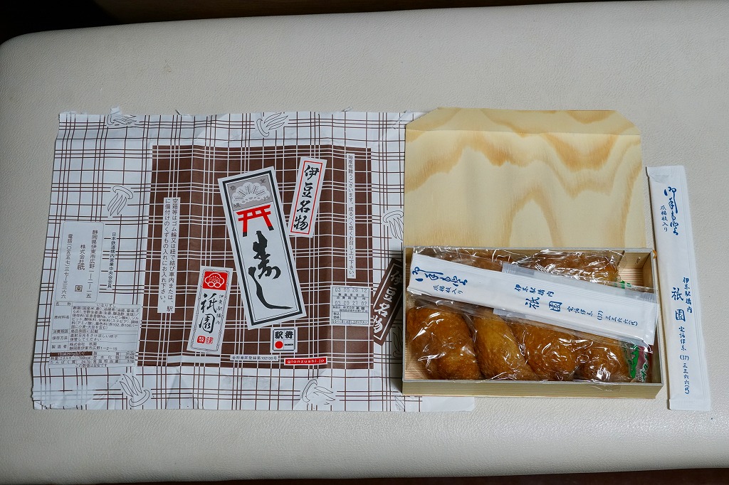 伊東駅では1959(昭和34)年3月に発売。稲荷寿司駅弁の最高峰、あるいは東の伊東駅、西の豊橋駅と並び称される逸品で、地元の伊東で愛されるおいなりさん。調製元は1946(昭和21)年に伊東で稲荷寿司店として創業し、評判をもって当時の国鉄伊東駅に進出した。