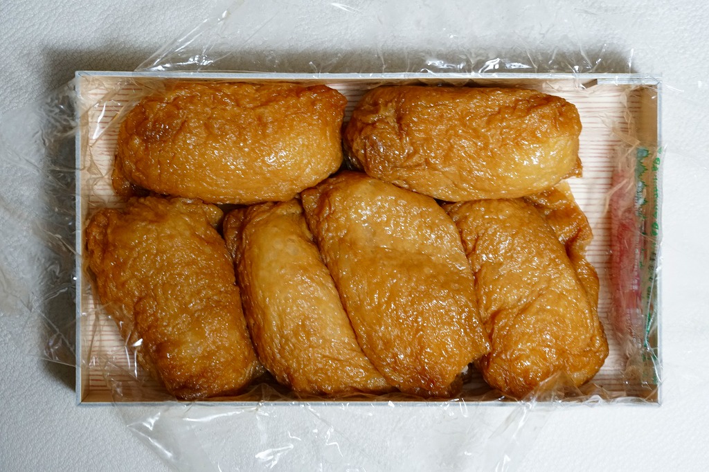外見は変哲のないおいなりさんが6つ。これらをまとめてラップで包み、ボール紙の容器に収め、木目柄のふたをして、包装紙でぴったり包む。辛さも甘さもほどほどで、酢飯はもちっとした食感。満腹でも食が進むような味に、その人気がうかがえる。毎年秋の明治神宮の例大祭に献上されるという売り文句もある。
