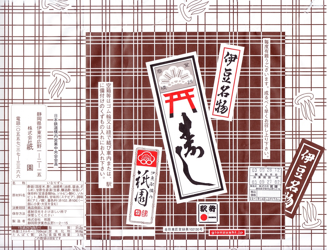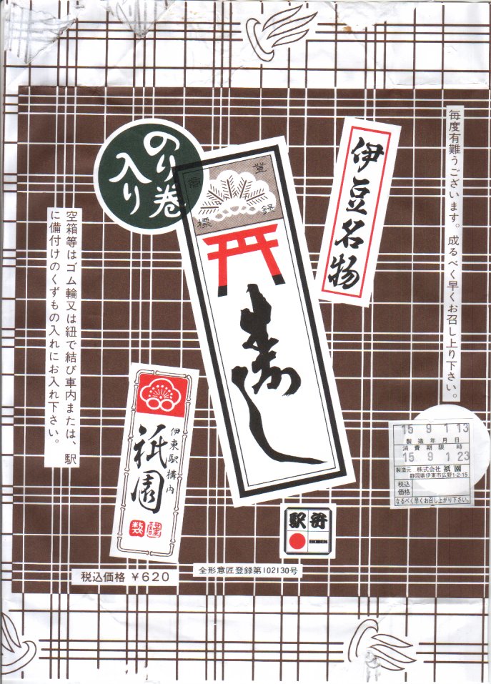 2003(平成15)年9月1日に購入した、伊東駅弁の包装紙。上記の2014年のものとの違いは、価格を掛紙に印刷していたことと、調製元公式サイトのURLがないだけ。中身や風味も、昭和時代から令和時代まで変わらない。