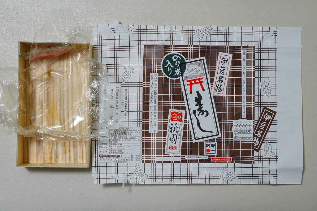 2021(令和3)年9月26日に購入した、伊東駅弁の紙箱。下記の2017年のものと同じ。栄養成分表示が底面に追加された。