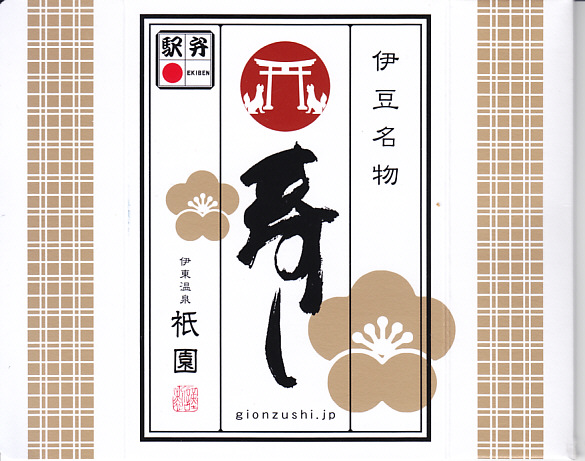 2008(平成20)年1月27日の調製である、伊東駅弁の包装紙。JR東日本横浜支社が2008(平成20)年1月26日と27日に、管内の駅弁屋4社(崎陽軒、大船軒、東華軒、祇園)を集めて横浜駅西口で実施したイベント「どんどん食べて!!記念・限定駅弁フェア」にて販売されたもの。いつもの絵柄に伊豆半島や特急電車やイベント名を加え、伊豆名物の表記を「伊東名物」に差し替えた、過去の伊東駅弁では記憶にない限定特別版だった。容器は中身は通常版の6個入りと同じ。