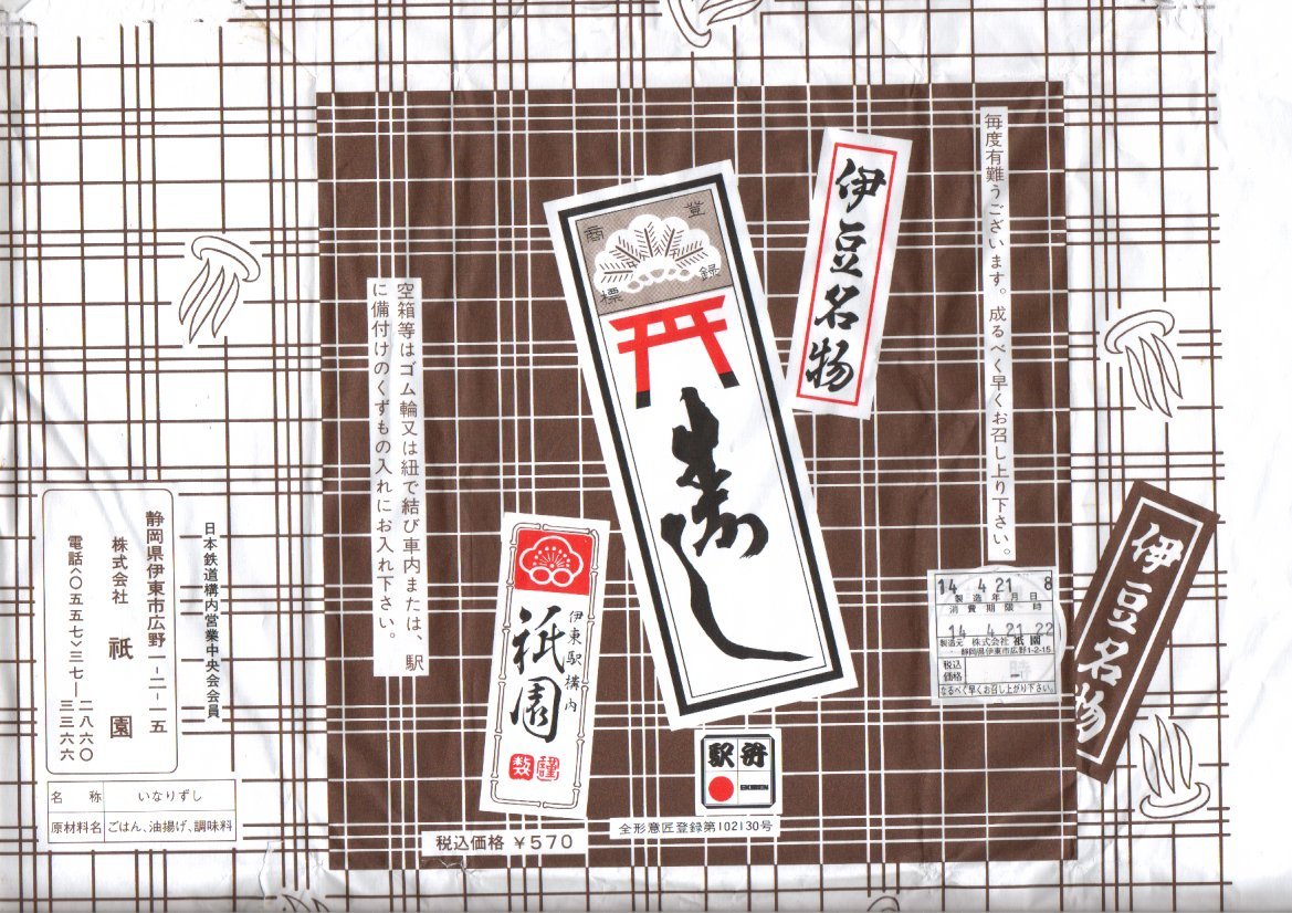 2002(平成14)4月21日に購入した、伊東駅弁のパッケージ。上記の2019年のものと、値段を除いてすべてがまったく同じ。市販容器の改廃がなかった点を含め、変化がないことに驚く。