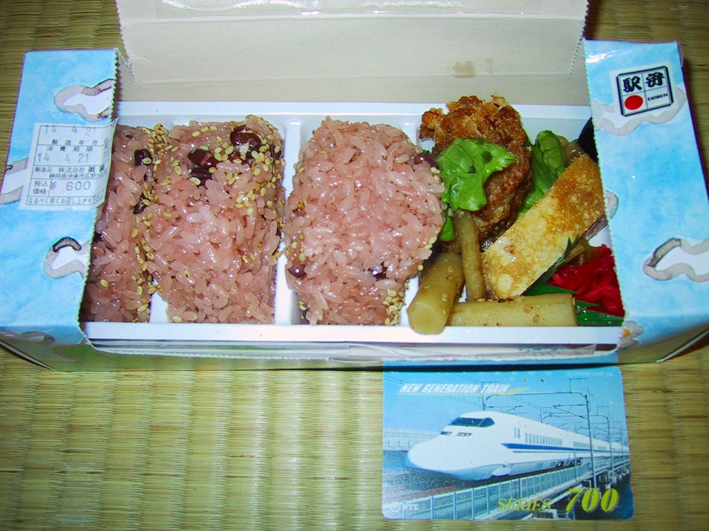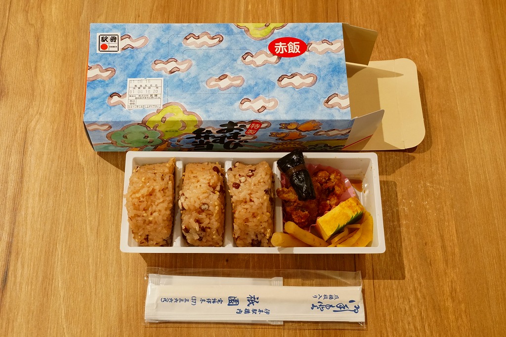 駅弁の名前は「赤飯おにぎり弁当」とも。上記の駅弁「特製おむすび弁当」の、容器とおかずを変えずに、おむすび3個を赤飯の握り飯に置き換えたもの。伊東駅弁ならではの鶏唐揚は入っているが、内容に伊東も駅弁もない感じ。こういう実用的な弁当を駅弁として売る駅弁屋は、それだけ地元で親しまれている証であり、そんな駅弁は安心して食べられる。