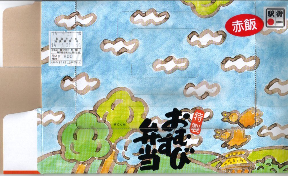 2014(平成26)年12月28日に購入した、伊東駅弁のシール。食品表示の量により、デザインには変化がみられるが、絵柄や内容は上記の2022年のものと変わらない。容器や中身や風味は、まったく同じ。