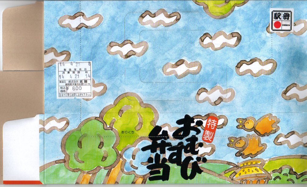 2002(平成14)年4月21日の調製である、伊東駅弁の包装紙。現在のもの、そして過去のものと、ほとんど変わらない。だから古書店やネットオークションに古い掛紙が出てきても、あまり良い値段が付いていない。