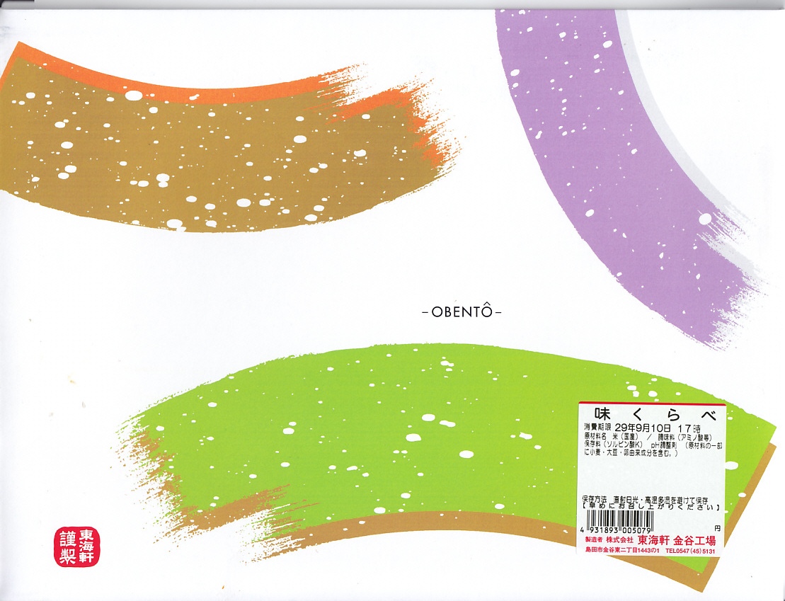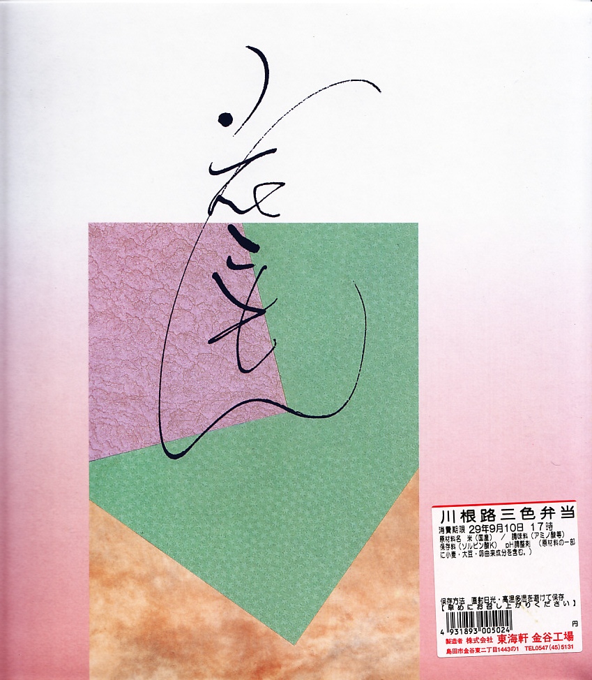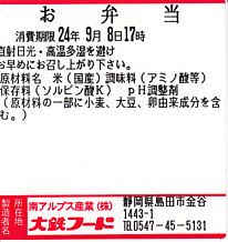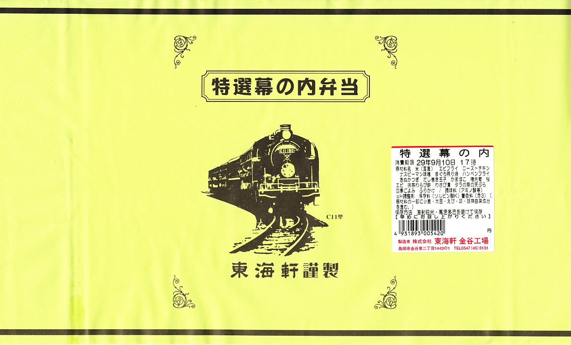 2012(平成24)年9月8日に購入した、金谷駅弁の掛紙。当時の調製元は大井川鐵道の子会社である南アルプス産業「大鉄フード」であった。鉄道会社の経営難で2014(平成26)年2月に弁当部門を静岡駅弁の東海軒へ身売り、「東海軒大鉄フード」の名称を一時的に使い、ほどなく東海軒金谷工場と表記するようになった。価格と調製元の表記を除き、5年後とまったく同じ。