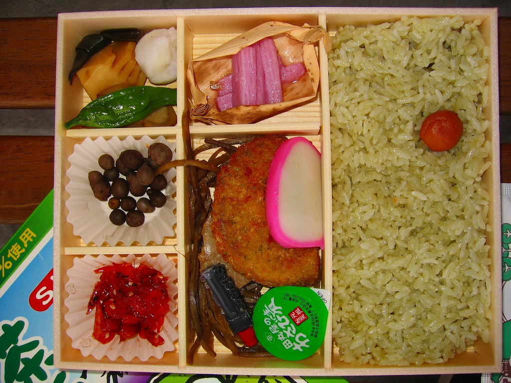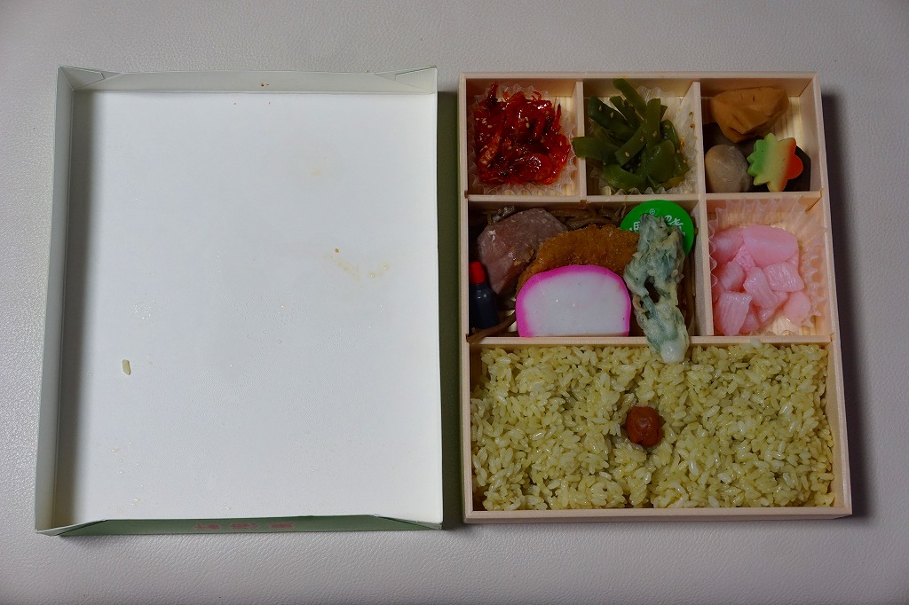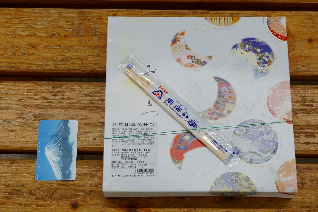 中身はサクラエビを混ぜた御飯の「富士山むすび」、ウナギ蒲焼を刻んで巻いた巻き寿司「うなぎロール」、マグロのメンチカツ、山里の天ぷら、タケノコやサトイモなどの煮物、わさび漬カップ、缶詰みかんなど。宣伝文や解説でうまく見せれば、おしゃれな駅弁になる気がした。2013年までの販売か。