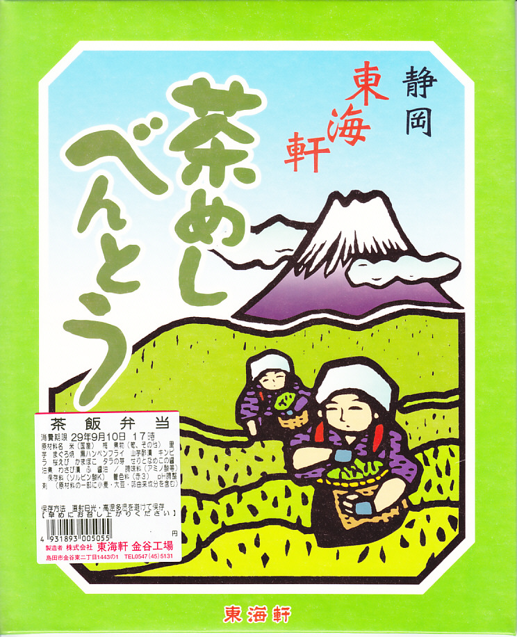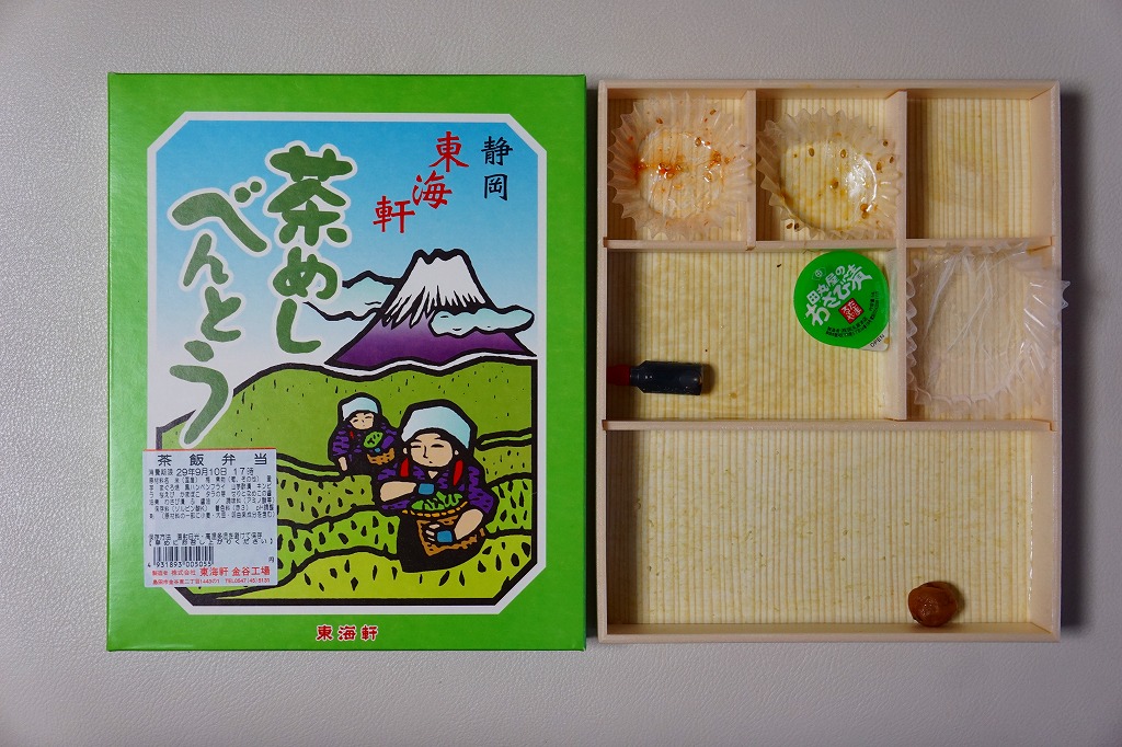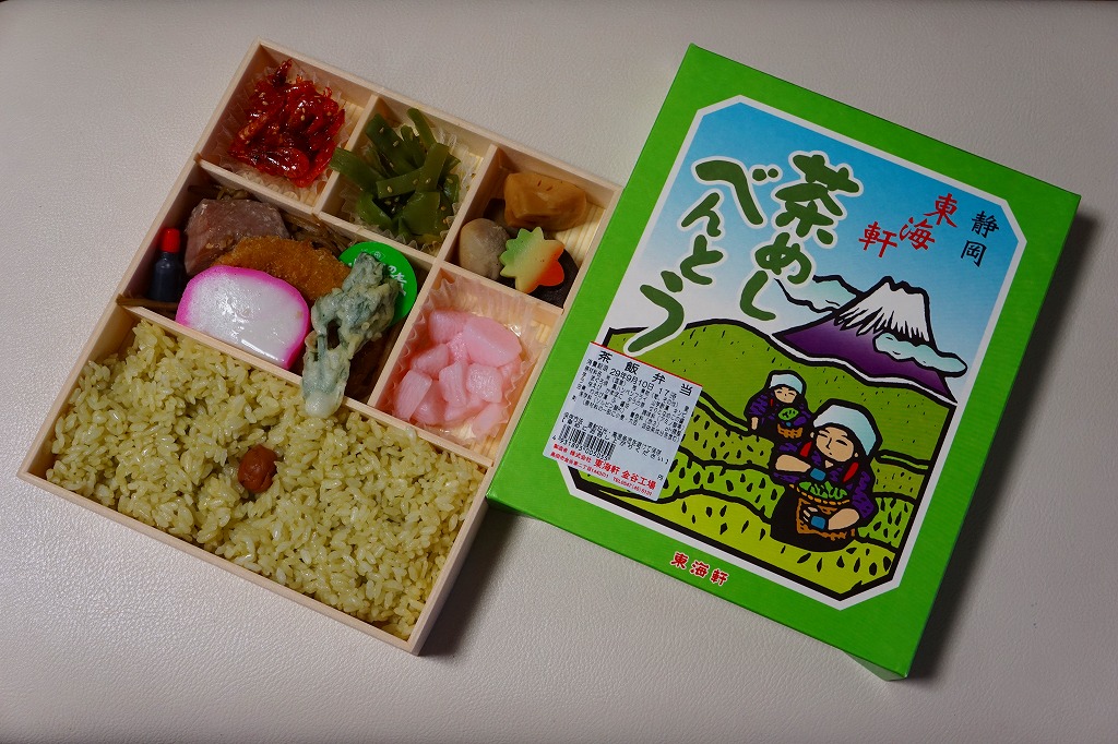 2005(平成17)年の春頃に発売。過去には要予約の駅弁とされたこともあった。醤油飯でなく文字通り緑茶で炊いた茶飯に、焼マス、黒はんぺん揚、マグロ照焼、タラの芽天、かまぼこ、きんぴらごぼう、山芋の酢漬、サトイモやタケノコなどの煮物、サクラエビ佃煮、わさび漬などのおかず。抹茶系の渋みや苦みはなく不思議な冷涼感が漂う。