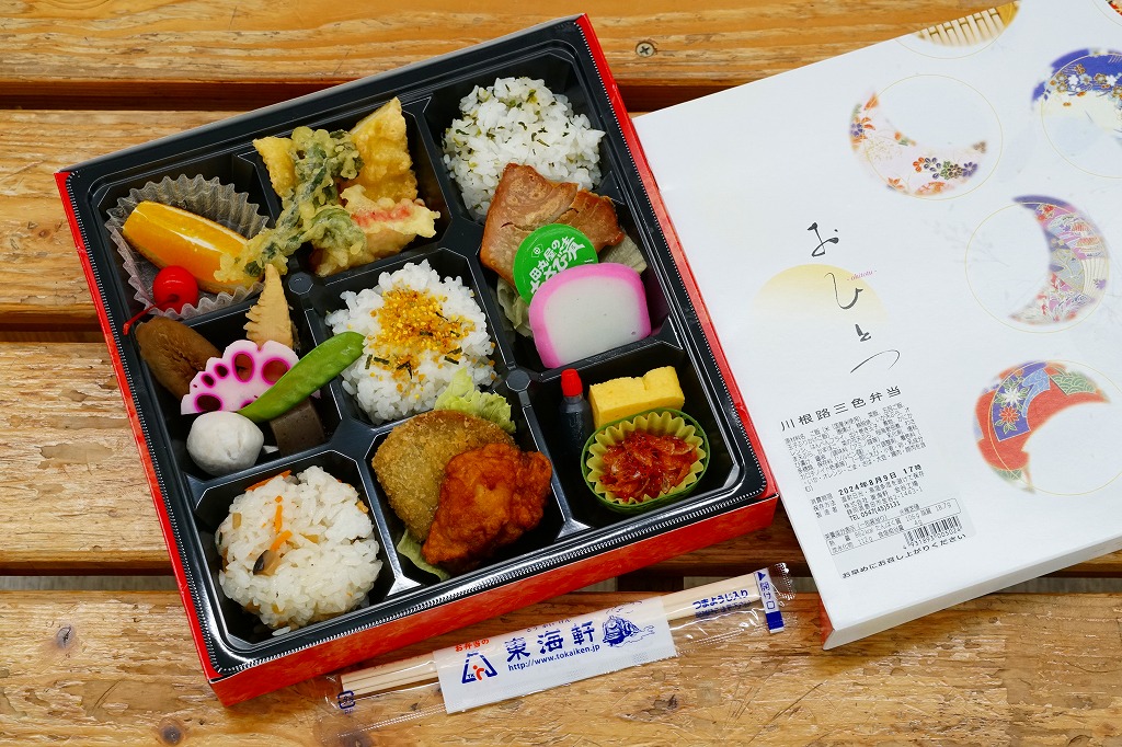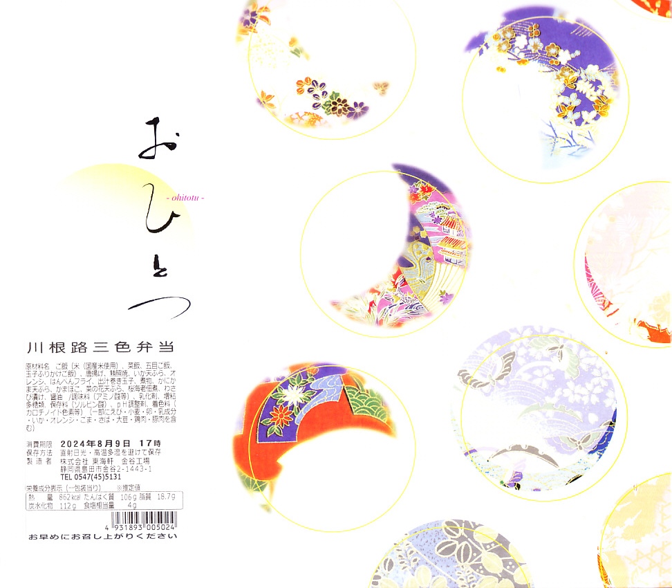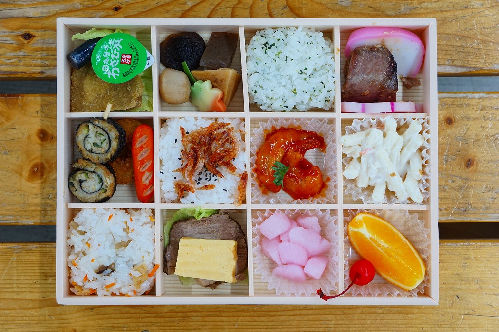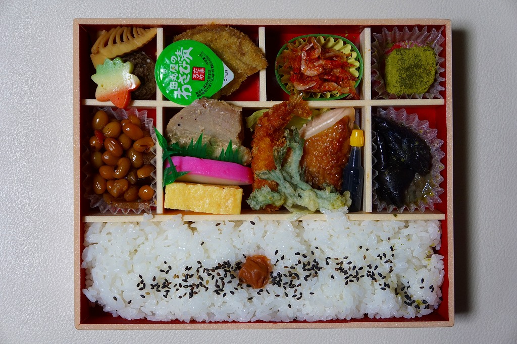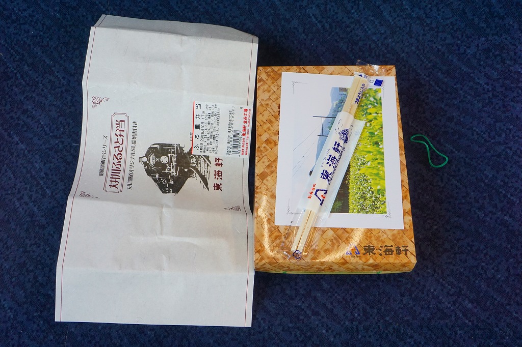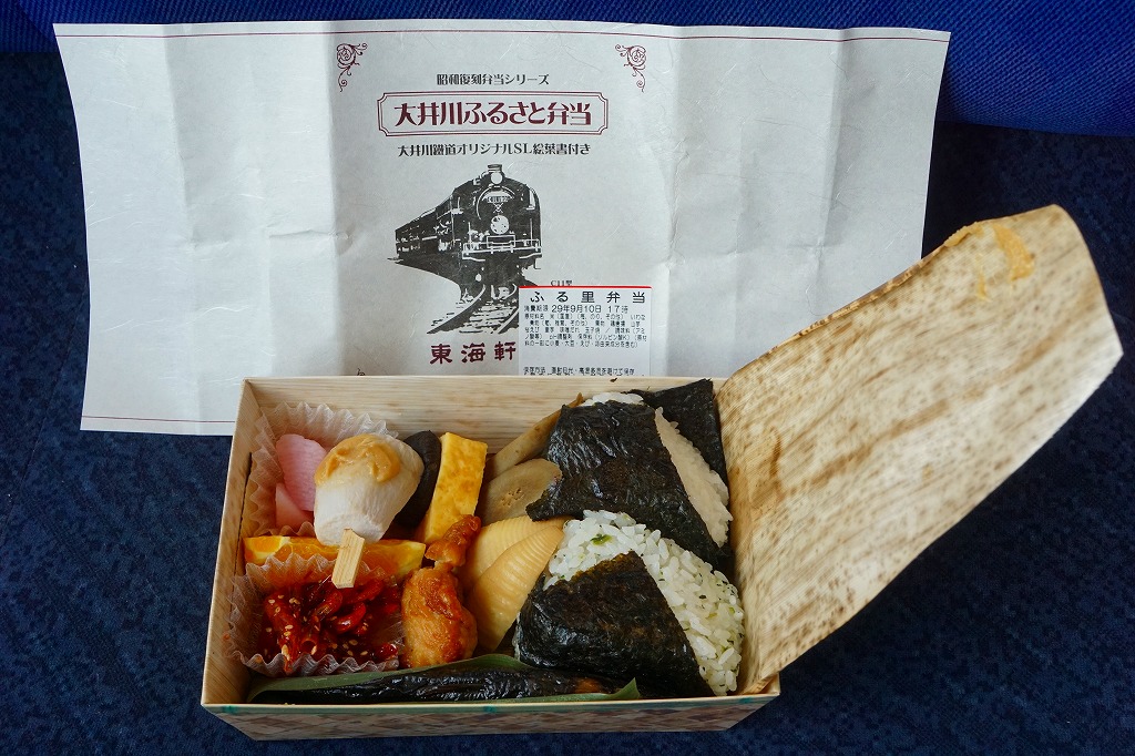 2016(平成28)年までに発売か。既存の「大井川ふるさと弁当」と同じような絵柄の掛紙で、大きく平たい容器を包む。中身は日の丸御飯に7区画のおかず、エビフライやローストチキンやマグロ照焼と玉子焼とかまぼことタラの芽天、ナスピーマン味噌、黒はんぺん揚げとわさび漬、サクラエビ佃煮、五目豆、抹茶わらび餅。下の「川根路三色弁当」や「味くらべ」と同じようなものが入るお弁当。価格は2017年の購入時で1,150円、2019年時点で1,200円、2022年4月から1,250円。