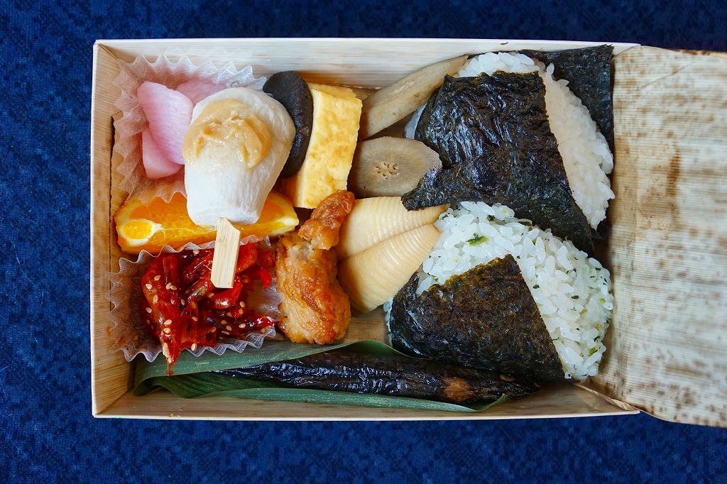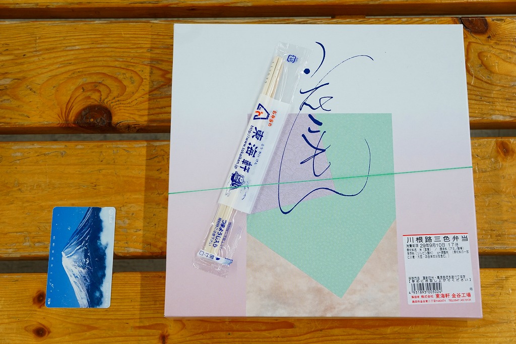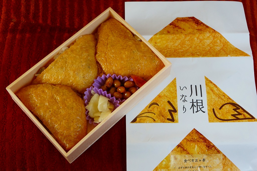 川根いなりとは、2010(平成22)年から静岡県島田市川根町、大井川鐵道の駅でいうと家山駅や抜里(ぬくり)駅のあたりで、地域ぐるみで取り組まれているプロジェクト。2011(平成23)年1月に地域で結成された「川根いなりで包んであげ隊」では、川根いなりのルールを「形は三角形で川根を囲む山々を表すべし」「加盟店が思う“川根らしさ”を1個だけ取り入れるべし」「川根茶とともに振る舞うべし」で、食べ方の提案を「必ず川根の空気も一緒におなかに入れながら食すべし」「大切な人と食すべし」「食べて思いだした何か、を人に伝えるべし」と定義、後者がこの駅弁の掛紙にも記される。ネット上では2012年以降は表だった活動が見えないが、川根温泉の食堂で提供されたり、こうやって駅弁のようなものになったりしている。この駅弁は、2022年からは売られていないかもしれない。