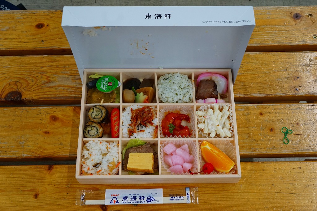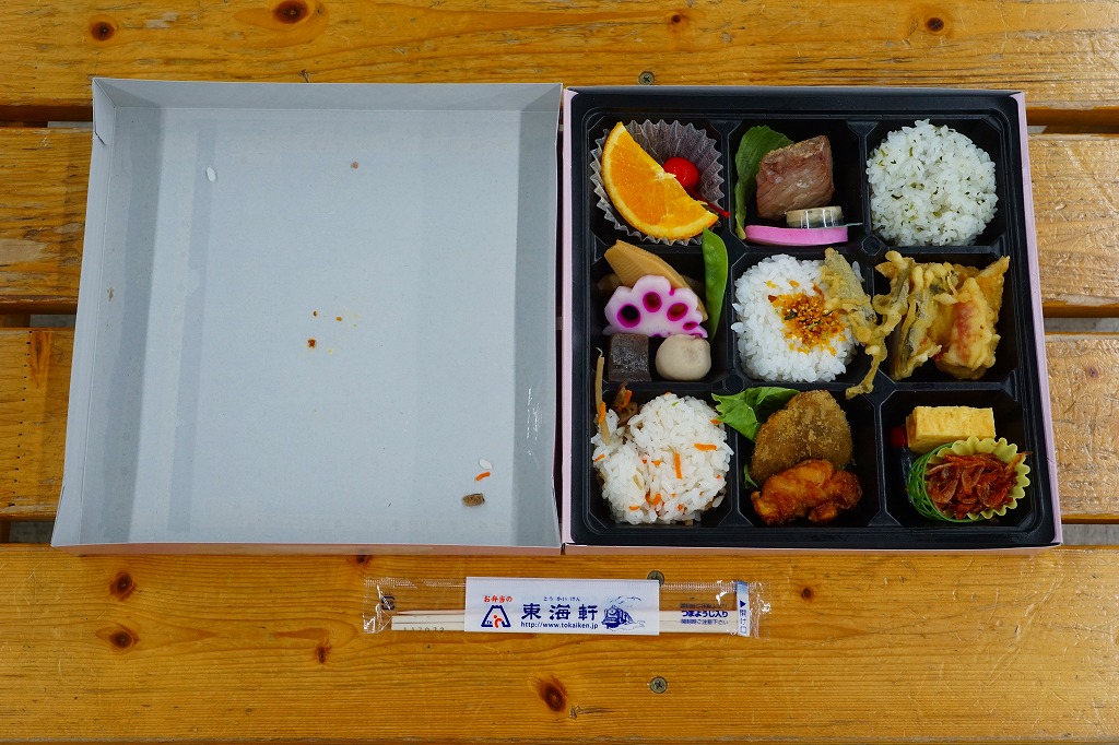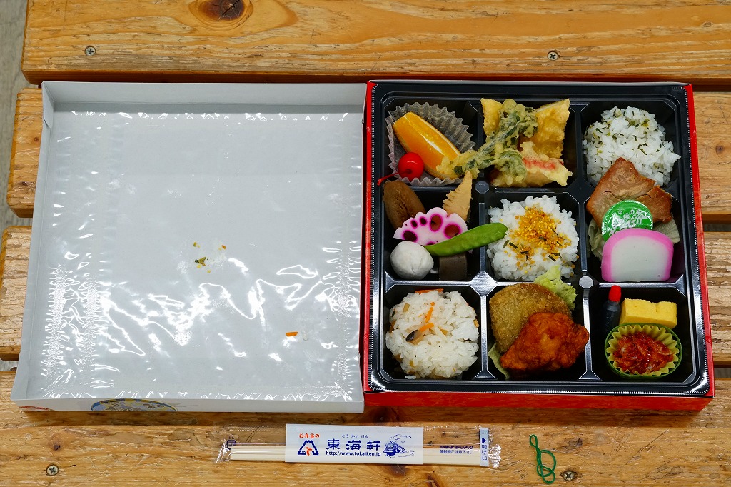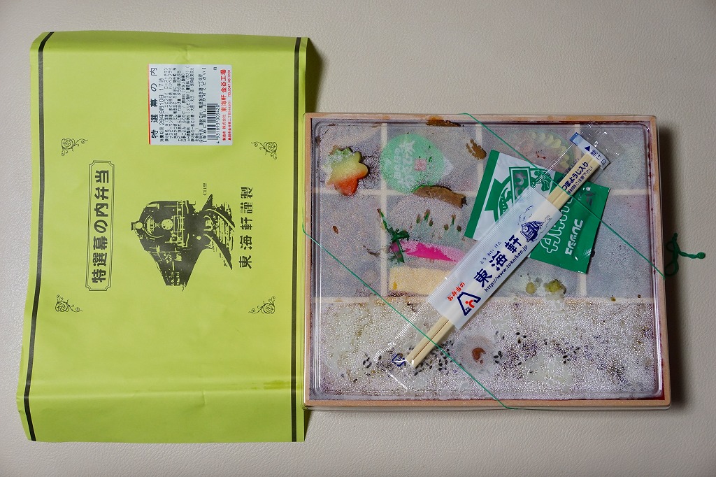 東海軒の仕出し弁当向けボール紙製容器をそのまま使用、12区画に仕切られた中身は、のり、サクラエビ、五目の三色の御飯、マグロ照焼とれんこんとかまぼこ、マカロニサラダ、ナガイモの酢漬け、エビチリ、チャーシューと玉子焼、サトイモやタケノコなどの煮物、鶏肉巻やウインナーなど、黒はんぺん揚げとわさび漬。上の駅弁「川根路三色弁当」の上等版のようなものか、中身の少なからずが共通で、雰囲気もやはり団体向け仕出し弁当という雰囲気。値段を見ると高級な駅弁だが、印象はどうも安っぽい。