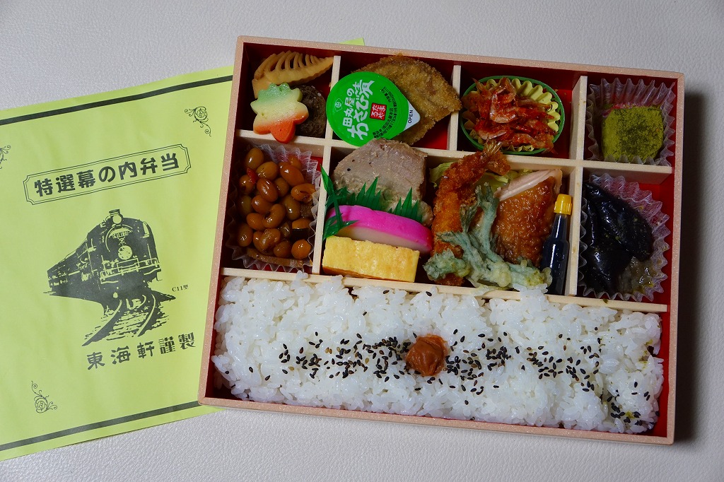 弁当にはSL写真の絵葉書が添付され、購入時は「さくら」のヘッドマークを付けるC11形蒸気機関車の姿。ローカル線向けの小柄なタンク機が天下の寝台特急を牽引したかな?と一瞬考えたが、そういえば昭和40年代に3年間だけ、短区間だけ列車の進行方向が逆になる佐世保線の早岐駅と佐世保駅の間で牽いていた。さすがSL動態保存運転の先駆者、やることがしっかり史実に基づいている。東京駅と長崎駅を結んだ寝台特急列車「さくら」は、佐世保駅発着分が1999年12月に、列車そのものが2005年3月に廃止された。