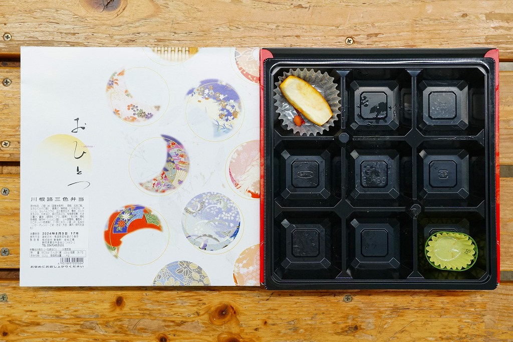 上記の駅弁「川根路三色弁当」の、2017(平成29)年時点での姿。紙箱の絵柄が異なるが、市販の惣菜弁当向け容器であることに変わりない。その構造と中身は同じ。