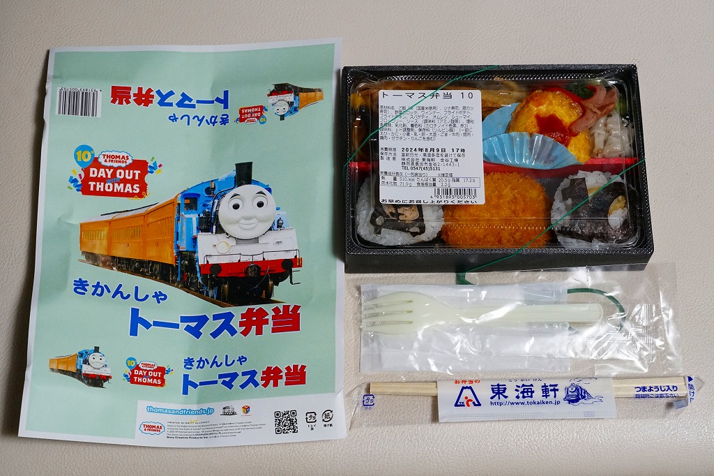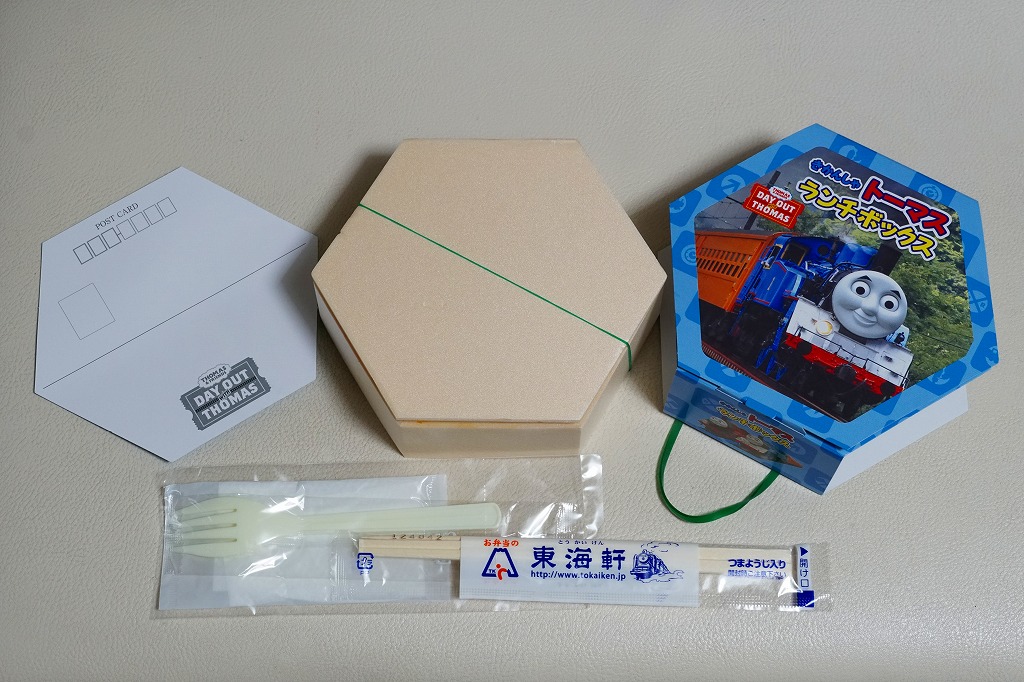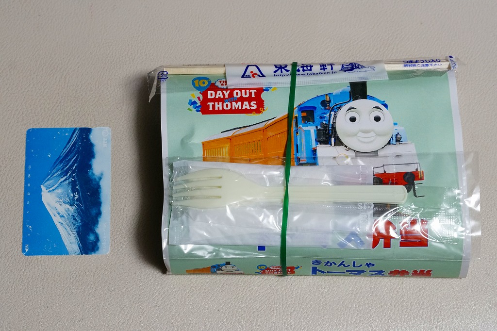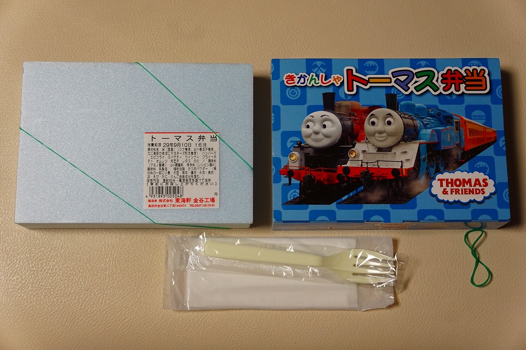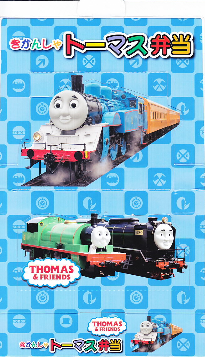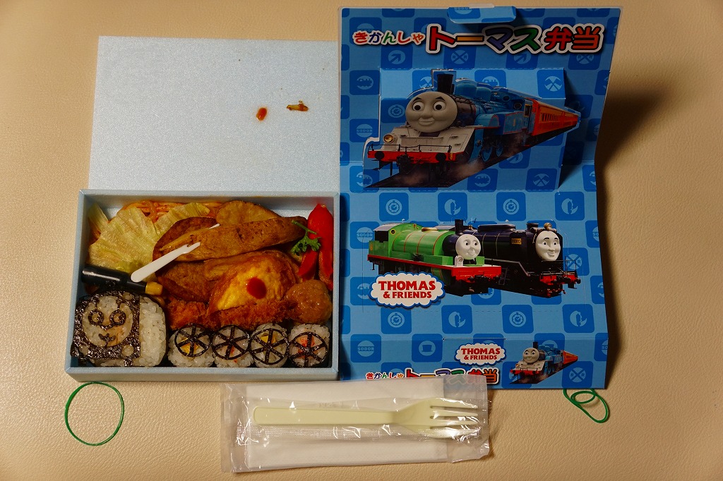 キャラクター柄でない水色の折箱に収めた中身は、ツナの太巻きと、カニカマと玉子焼の細巻き、ハンバーグ、エビフライ、スパゲティ、ウインナー、フライドポテト、オムレツ、肉団子など。子供向けというか、ジャンクフードというか、まるで冷凍商品の詰合せ。そんな中身が何であれ、キャラクター列車を彩る関連グッズで、トーマスに会いに来た子供たちの記憶に残ることだろう。駅に加えて列車内でも売りに来た。なお、きかんしゃトーマスの駅弁は先に新神戸駅で出ている。2020年の夏までに「きかんしゃトーマスランチボックス」と交代し終売。