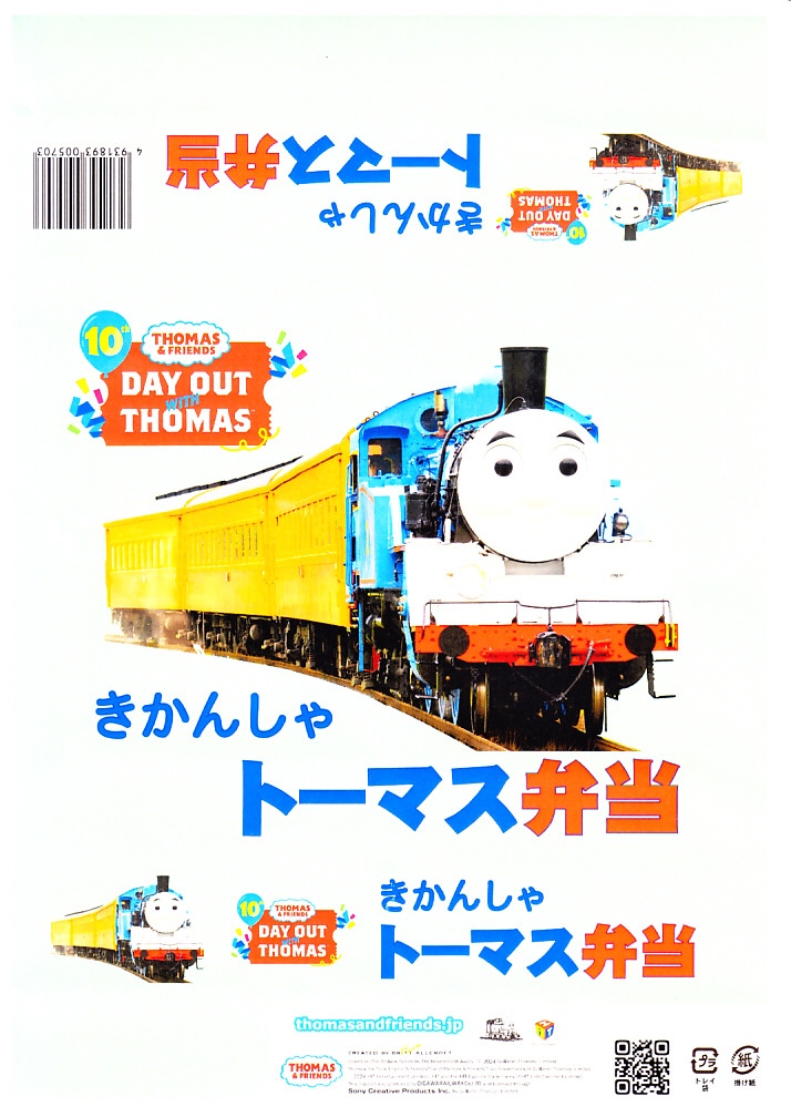 大井川鐵道のSL列車「きかんしゃトーマス号」の運行開始に合わせて、2014(平成27)年7月に麦茶付きで950円の予約専用弁当として発売、翌年6月に中身を買えて単体で一般販売を開始した模様。パッケージの絵柄はもちろん、イギリスの幼児向けテレビ番組「きかんしゃトーマス」のキャラクター。上面のトーマスとジェームスは、大井川鐵道の蒸気機関車を装飾した実物の写真である。