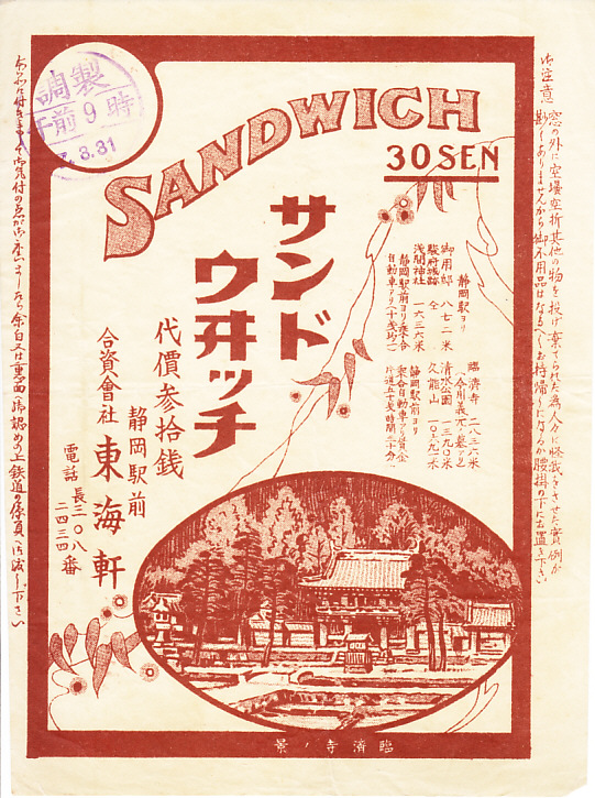 1932(昭和7)年3月31日9時の調製と思われる、昔の静岡駅弁の掛紙。その価格は当時の幕の内弁当と同じ水準であり、現在とは違いサンドイッチは高級な駅弁だった。掛紙に描かれる寺院は、静岡駅の北側で駿府城の向こう側にある、今川家の菩提寺である臨済寺。