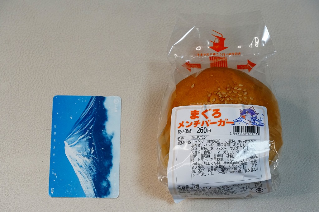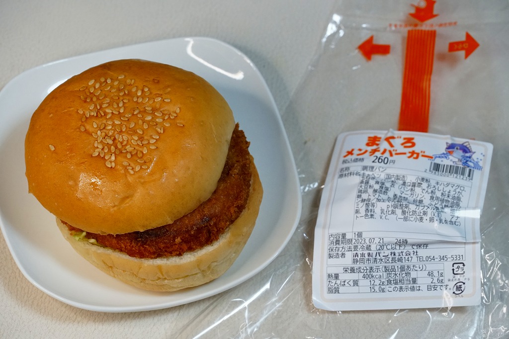 静岡駅のキヨスク系のコンビニや土産物店で売られていた、2種類のハンバーガーのうちひとつ。2000年代にはすでに売られていたらしい。キハダマグロのメンチカツを、真っ黒のソース漬けにしてキャベツとともにバンズで挟み、透明な袋に詰める。マグロは海と港のある日本全国ほとんどの府県で水揚げされ、山奥の旅館でも提供されて日本全国で買えたり食べられる地域性のない食材だが、静岡県は冷凍を含めたマグロ水揚げ日本一を名乗り、まぐろ類缶詰の生産量では全国シェア97%というくらいなので、量や加工で他を圧倒するマグロの産地。このまぐろバーガーも売り場には、名物の扱いでポップが出ていた。普通においしい、お魚フライのハンバーガー。調製元は静岡県清水で1941年に創業した、学校給食を主力とするパン製造業者。静岡の他駅のキヨスクでも買えるかもしれない。