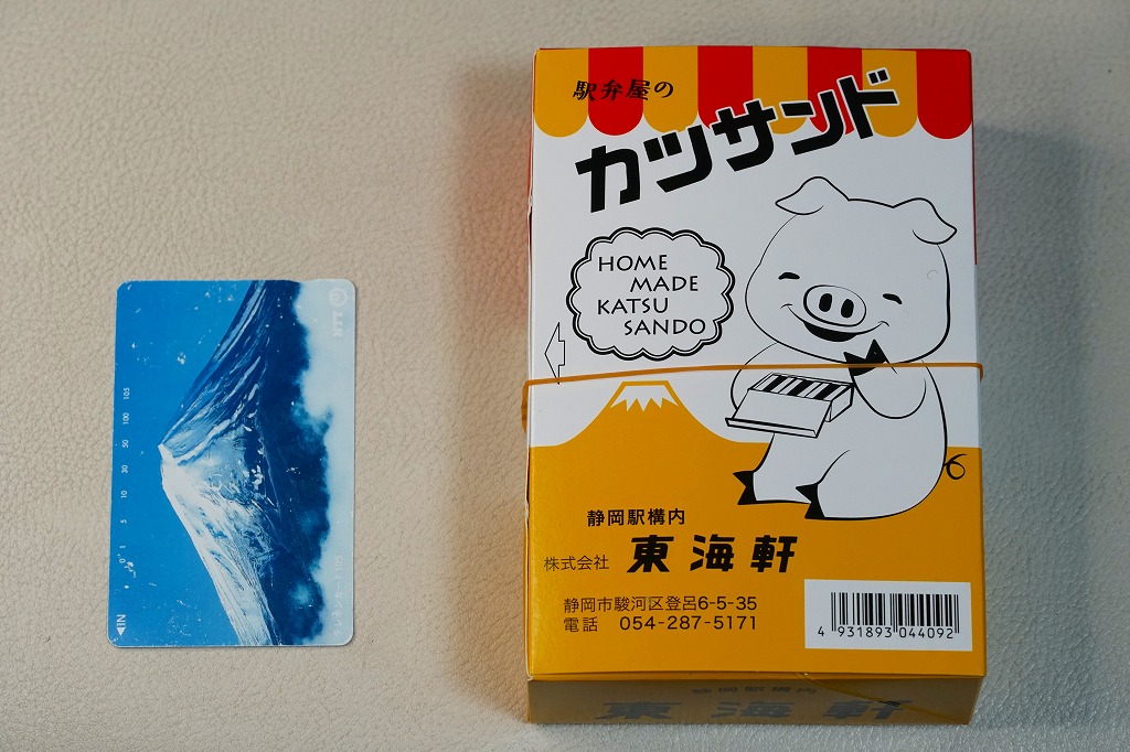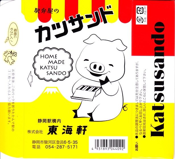 2012(平成24)年11月の発売か。21世紀の新商品であるにもかかわらず、見た目は昭和時代そのもの。静岡駅で伝統の駅弁「サンドイッチ」と同じ構造の紙箱に、レトロと表現されそうなデザインで、豚と富士と商品名と会社名を描く。