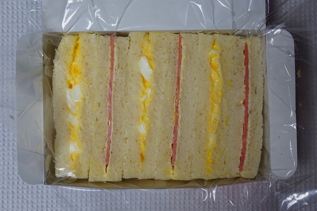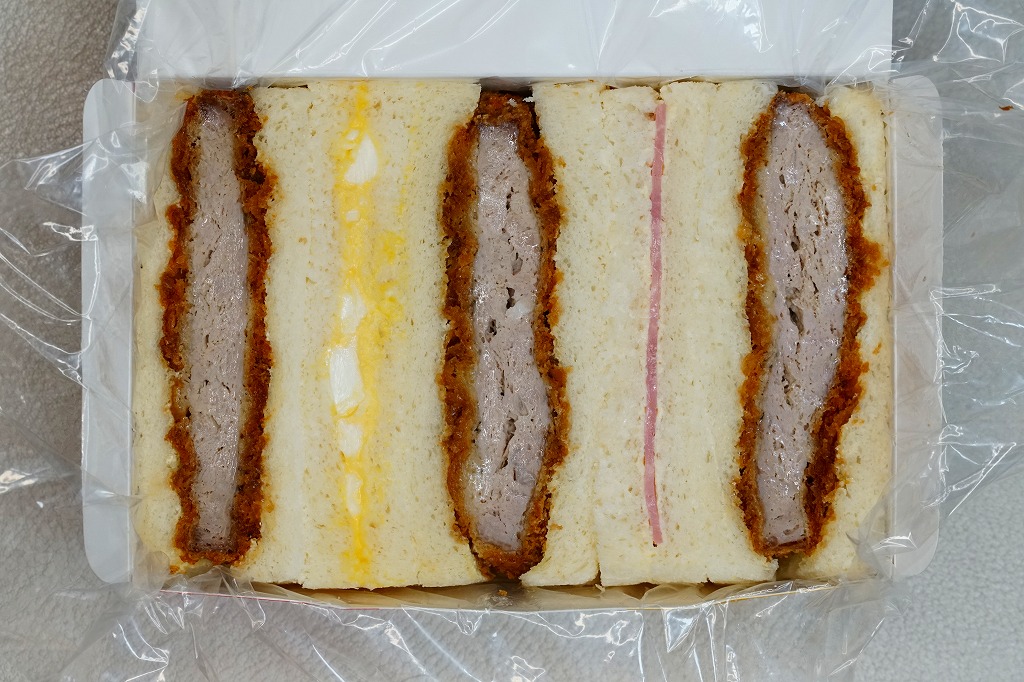 中身はヒレカツサンド3切れ、ハムサンド1切れ、タマゴサンド1切れ。通常のカツサンドは、駅弁でもスーパーでもカツサンドのみを詰めることが多いので、この組合せは独特である。メインのトンカツは、固いや硬いでなく「堅い」と表現したい締まり具合で、灰色と歯応えや形状がワイルドに思えた。価格は2013年時点で650円、2015年時点で670円、2019年2月から700円、2022年4月から750円、2023年7月から800円。