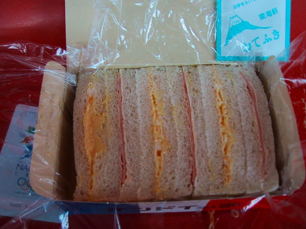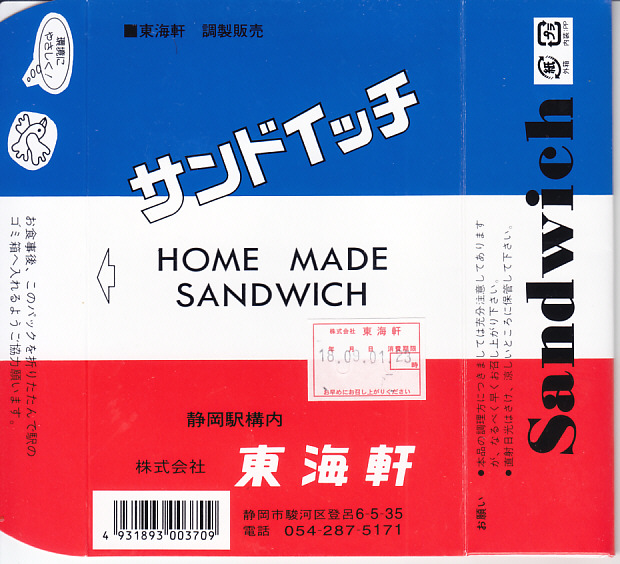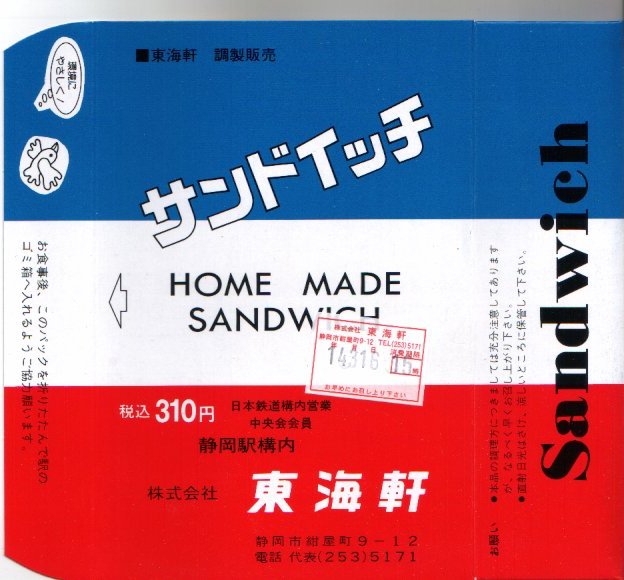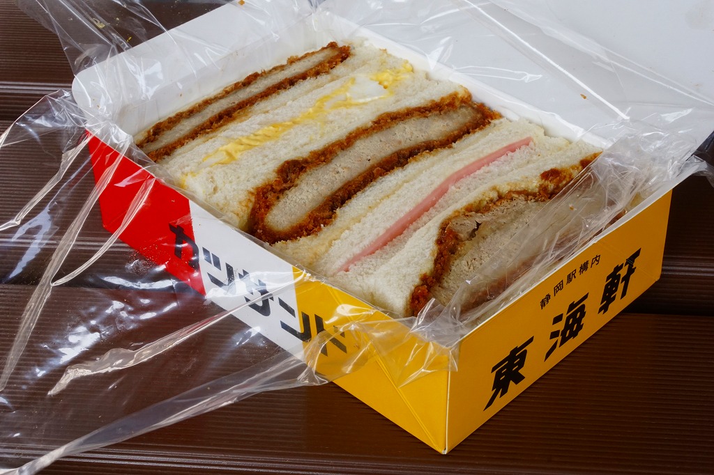 1900(明治33)年の発売という、静岡駅の駅弁屋さんのサンドイッチ。タマゴサンドとハムサンドが3切れずつ、まるごとラップに包まれて、国鉄時代から変わらない絵柄の紙箱に収める。静岡駅では1987年の国鉄分割民営化以降、平成時代にも、東京駅と岐阜県の大垣駅を結ぶ夜行快速列車の発着に合わせ、深夜2時頃の駅弁などのホーム上での販売が実施されていた。価格は2014年4月の消費税率改定で320円、2018年の購入時で340円、2019年2月から360円、2022年4月から450円、2025年時点で500円。