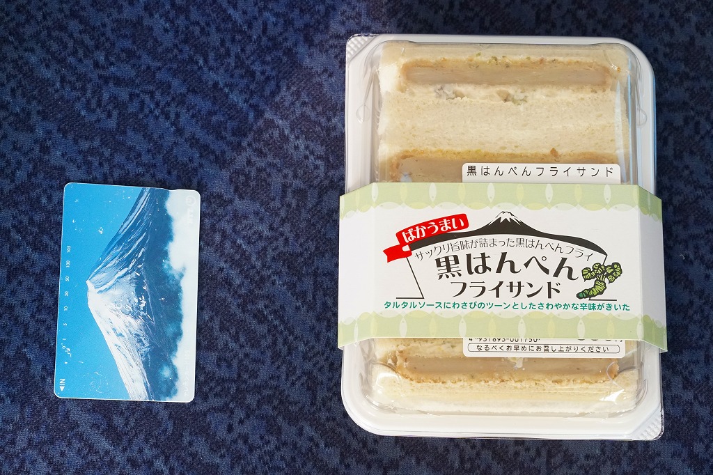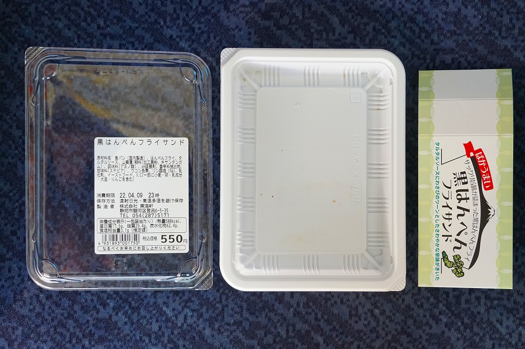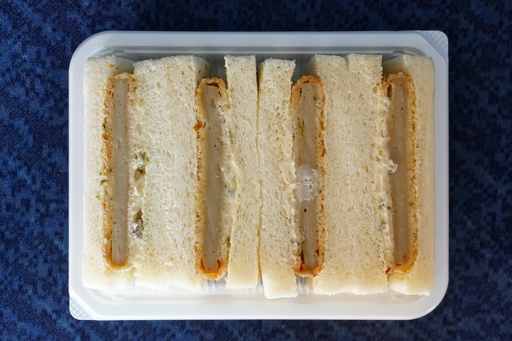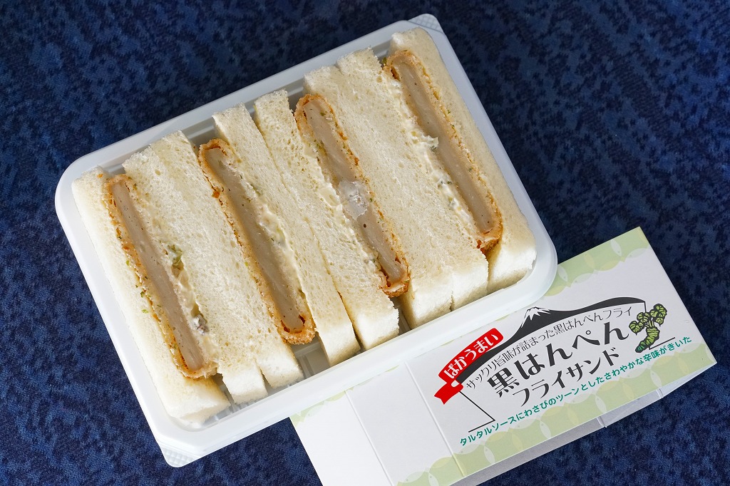 2018(平成30)年の4月までに400円で発売。黒はんぺんをフライにして、わさび漬けを混ぜたタルタルソースとともに、耳なし食パンに挟んだものを4切れ、サンドイッチ向けプラ容器にぴったり詰めて、商品名と宣伝文を書いたボール紙の帯で留める。味はイワシつみれ揚げのマヨネーズサンドといった感じで、風味の不思議な合わせ方が興味深い。価格は2019年時点で450円、2020年時点で500円、2022年時点で550円、2023年7月から600円、2025年時点で650円。