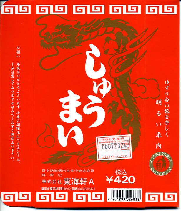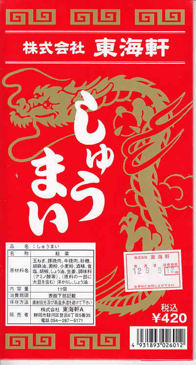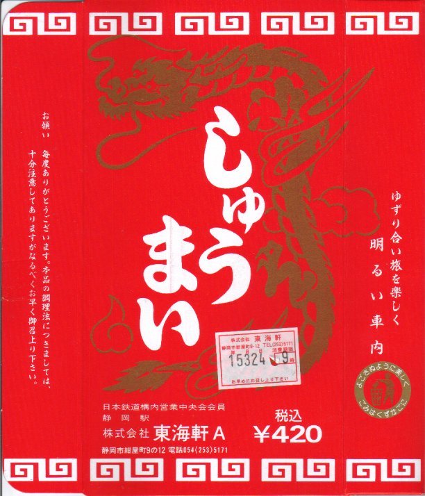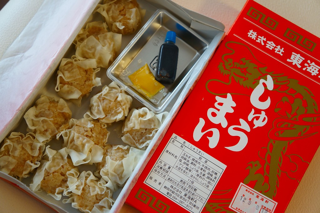 静岡駅伝統の駅売り焼売。赤い紙箱に肉焼売が11個入っている。焼売は横浜や小田原のものとほぼ同じサイズで、やや柔らかく大味な感じがする。今では東海道本線沿線を除くと札幌と鳥栖でくらいしか見られなくなった、駅弁スタイルの駅売り焼売。2015年頃までの販売か。