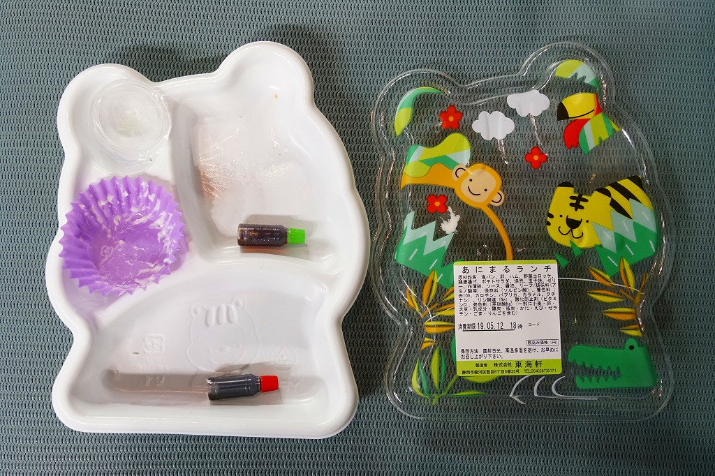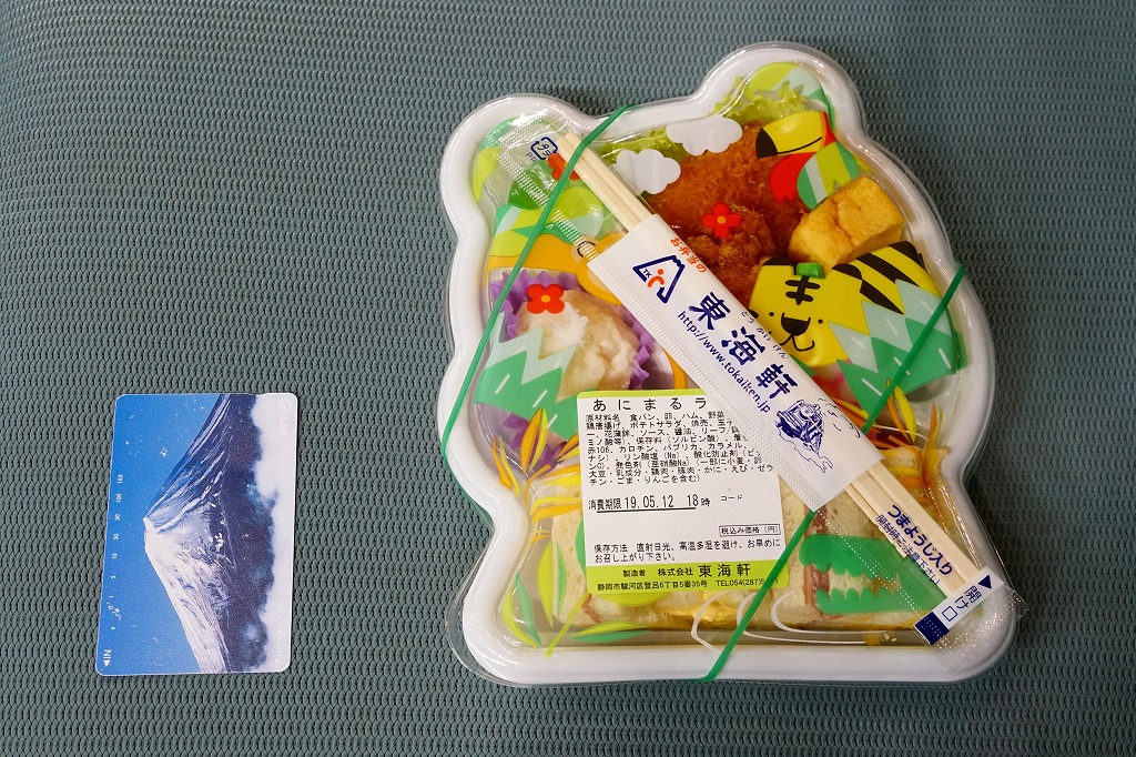 静岡駅の駅弁屋がつくる惣菜か。サルやトラやワニなどを描く動物園柄と思われる市販の惣菜向け変型プラ容器に、ハムサンドとタマゴサンド、ポテトサラダ、鶏唐揚と野菜コロッケと焼売とリーフ、ミニゼリーを詰めたミニ行楽弁当。イベントで購入したが、これは駅売り弁当なのだろうか。そんな商品に添付した駅弁と同じ割りばしの、汽車が走る重厚な絵柄が浮いていた。